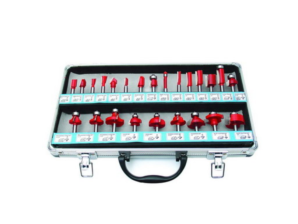 Tvarové frézy na dřevo - sada 24 ks, frézy jsou osazeny kvalitními SK plátky, různé druhy tvarových fréz bez nebo s vodícím kolečkem a kvalitním ložiskem, použití : pro frézování drážek a hran různých tvarů, stopka 8mm, balení : odolný hliníkový kufřík.Doplňkové parametry