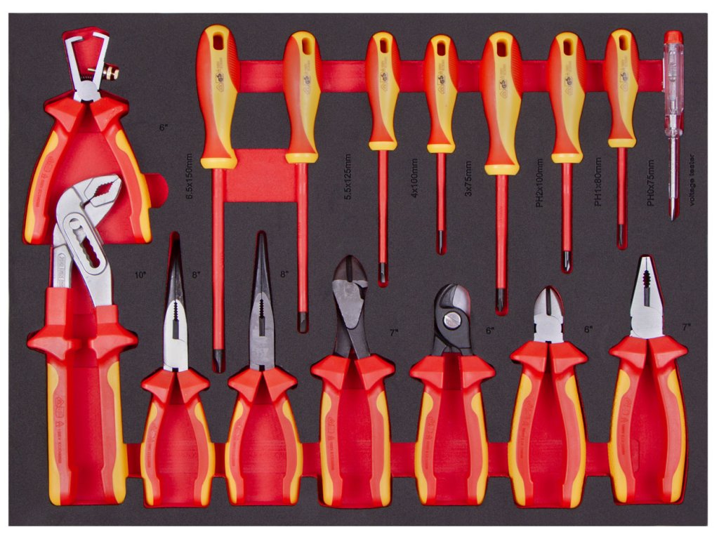 Kvalitní sada VDE izolovaného nářadí pro elektrikářské práce, přehledně uložená v pěnové výplni pro dílenské vozíky.
