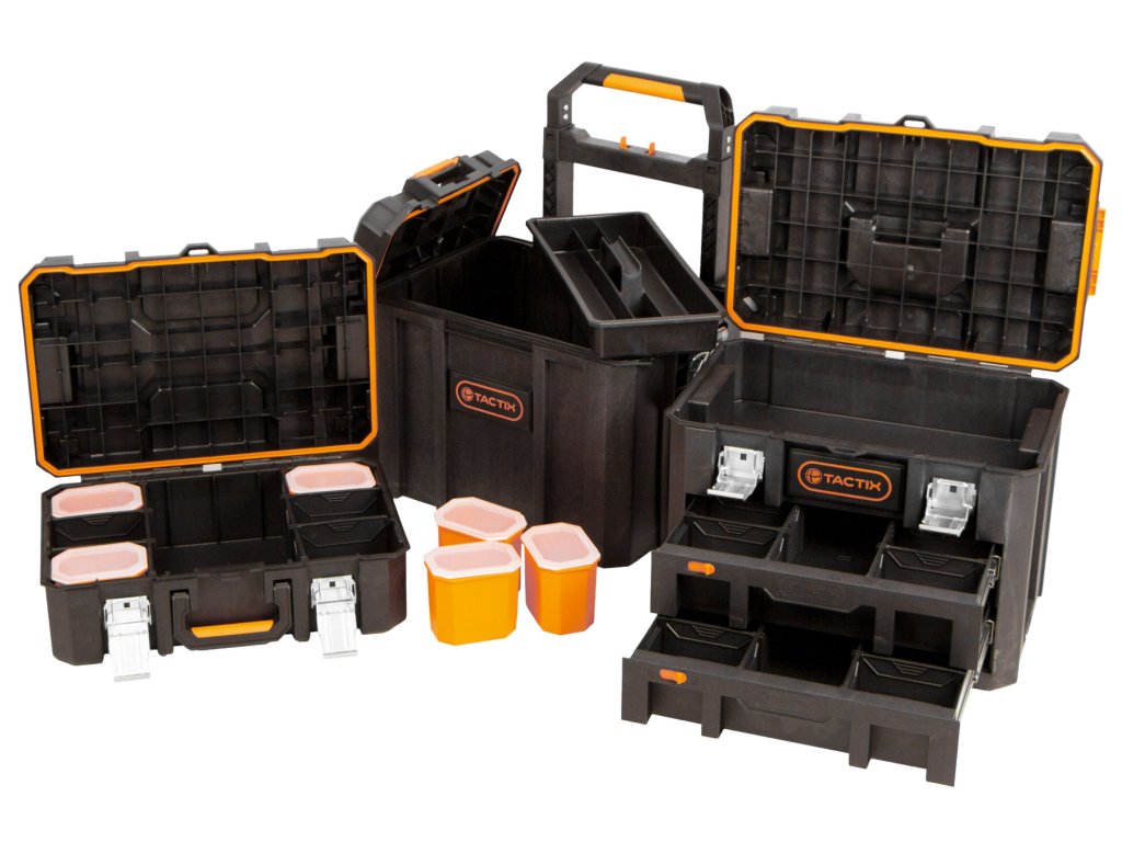 Hlavní výhodou kufrů od značky Tactix je jejich variabilita úložných prostorů, vodotěsnost a snadná manipulace celé sady díky madlu a kolečkům.