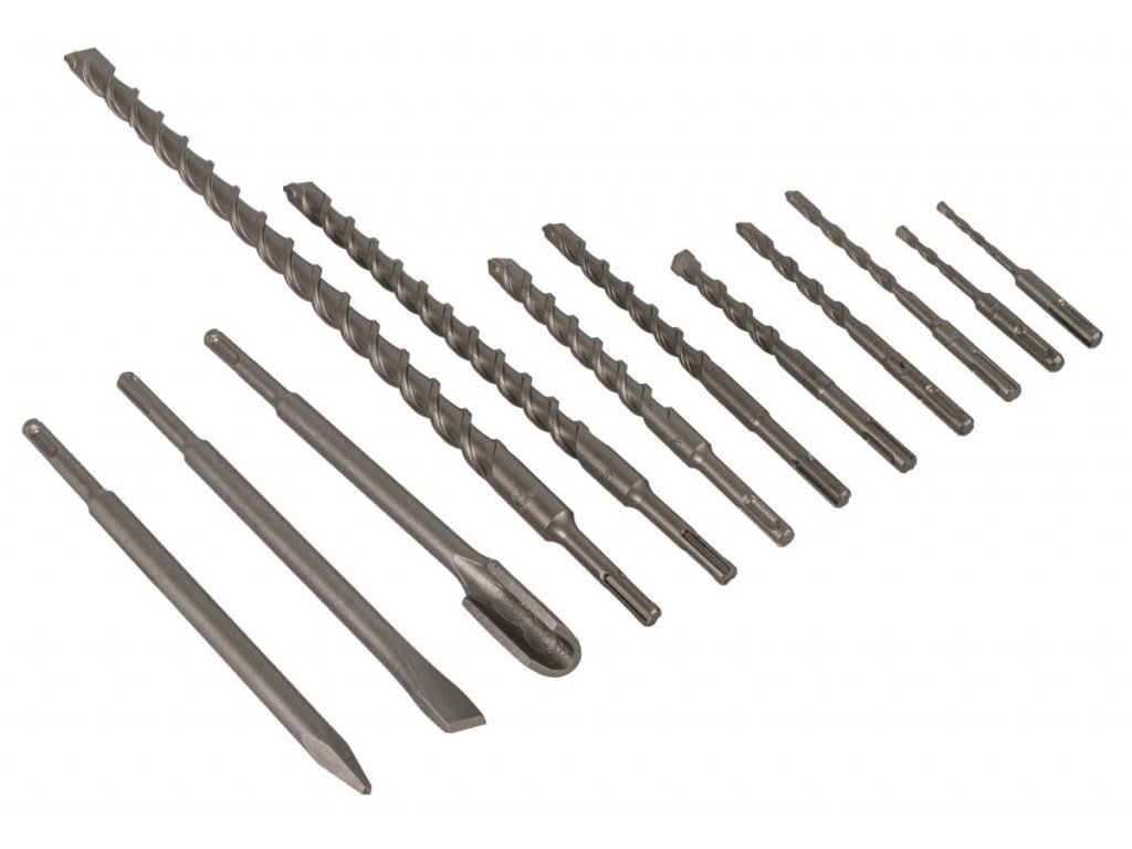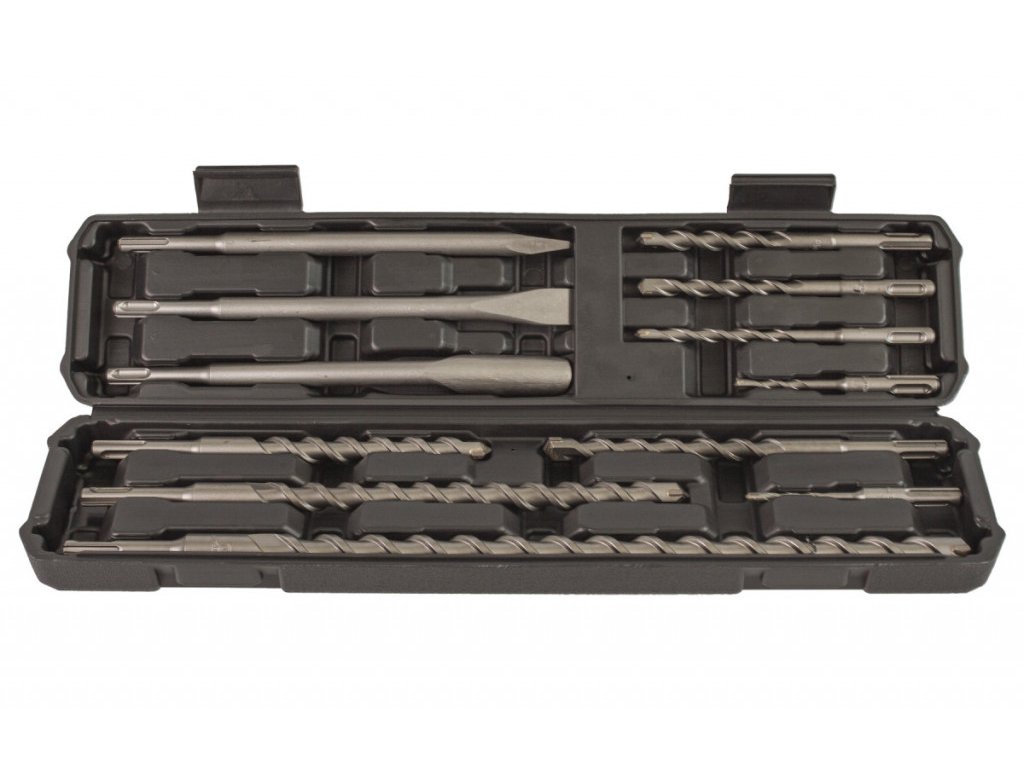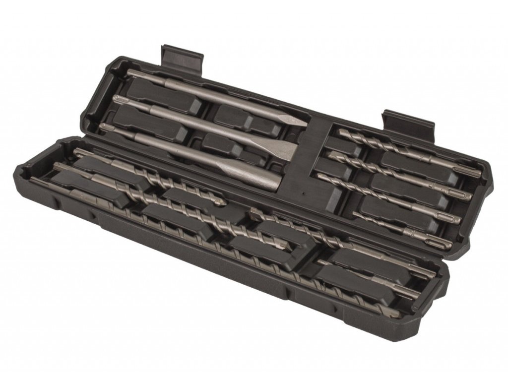 Sada obsahuje špičatý, plochý a drážkovací sekáč, stejně jako vrtáky různých průměrů a délek.