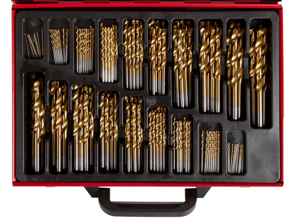 - Sada 170 vrtáků s titanovou povrchovou úpravou (dle normy DIN 338) a válcovou stopkou.