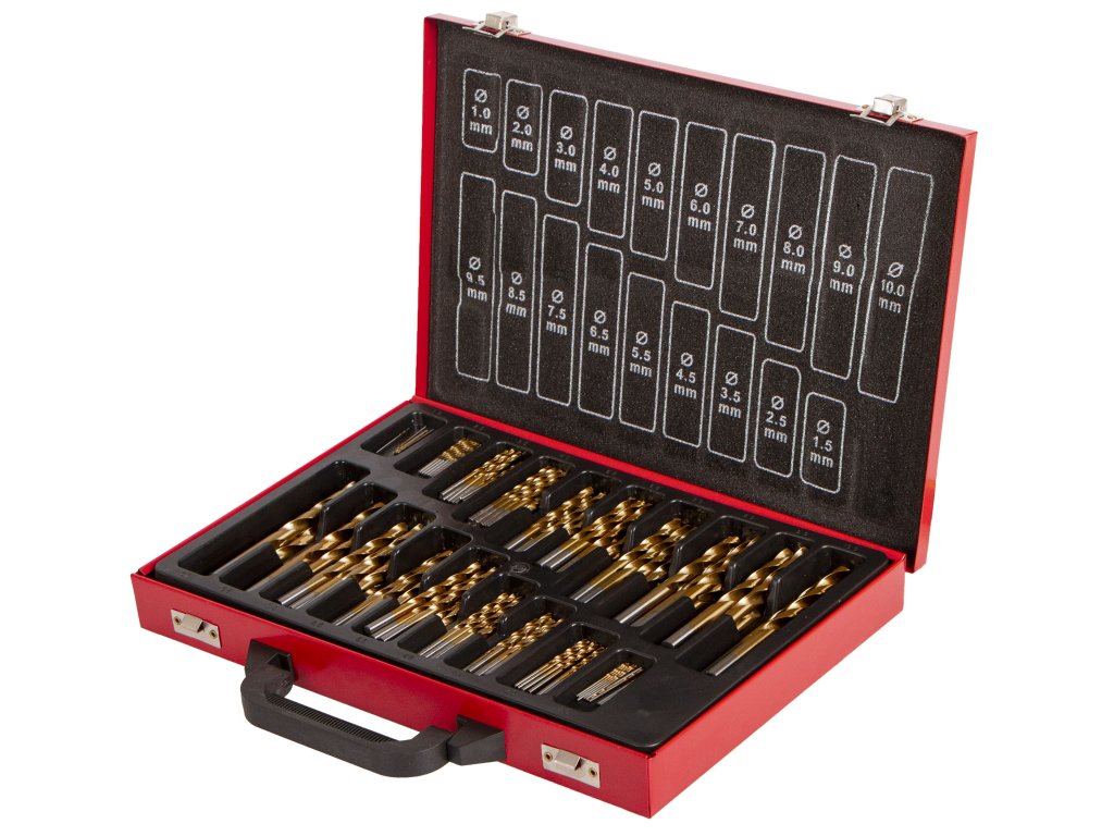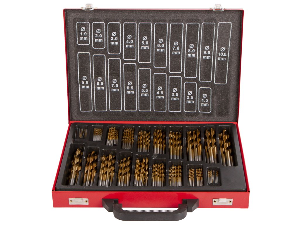 - Průměry: 1,0; 1,5; 2,0; 2,5; 3,0; 3,5; 4,0; 4,5; 5,0; 5,5; 6,0; 6,5; 7,0; 7,5 a 8,0 mm po 10 kusech a vrtáky 8,5; 9,0; 9,5; 10,0 mm po 5 kusech.