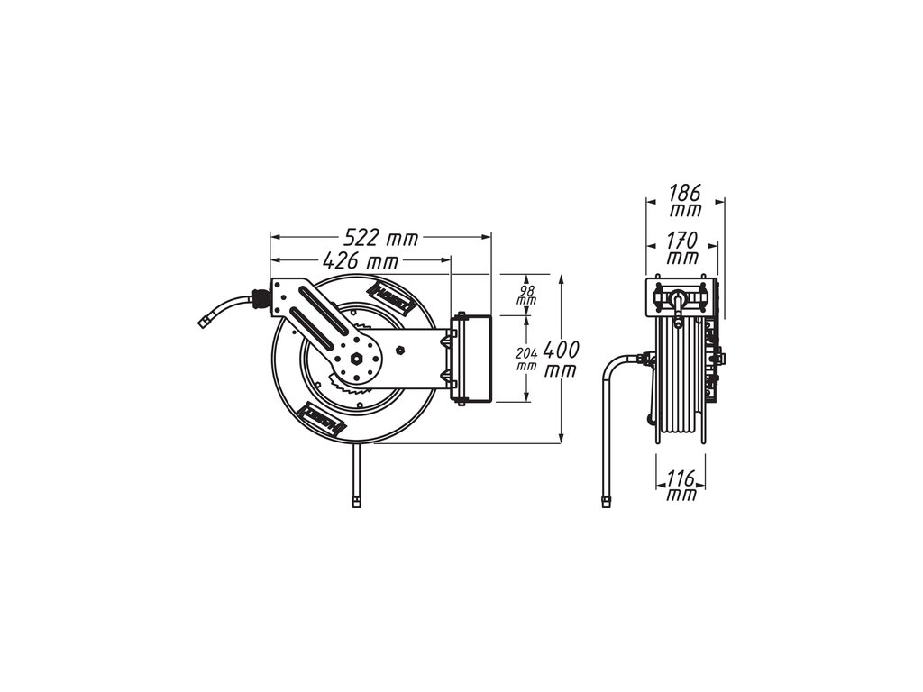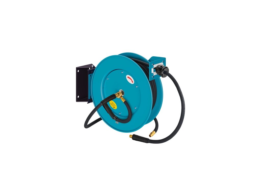 Naviják je určen pro práci se stlačeným vzduchem a snadno se montuje pomocí kovového ramene nebo otočné základny, která se může otáčet až o 180°.