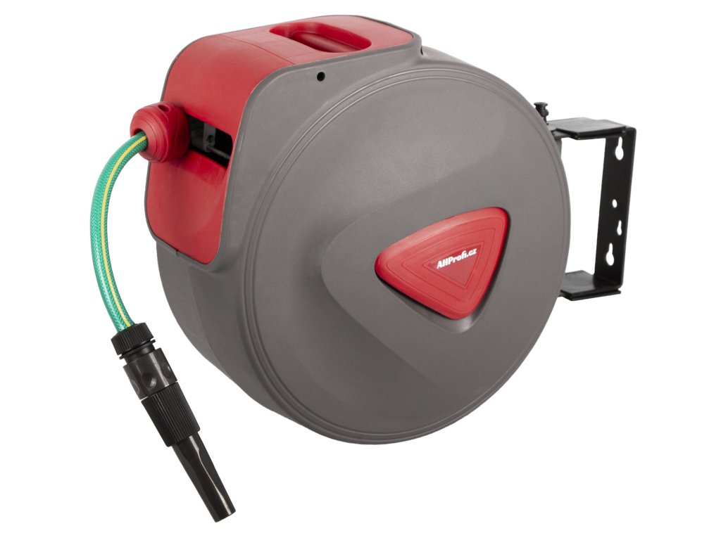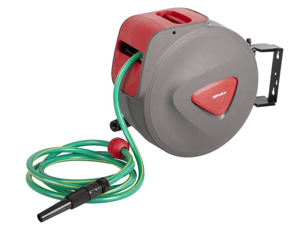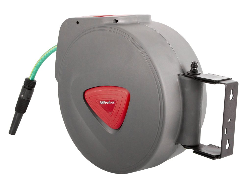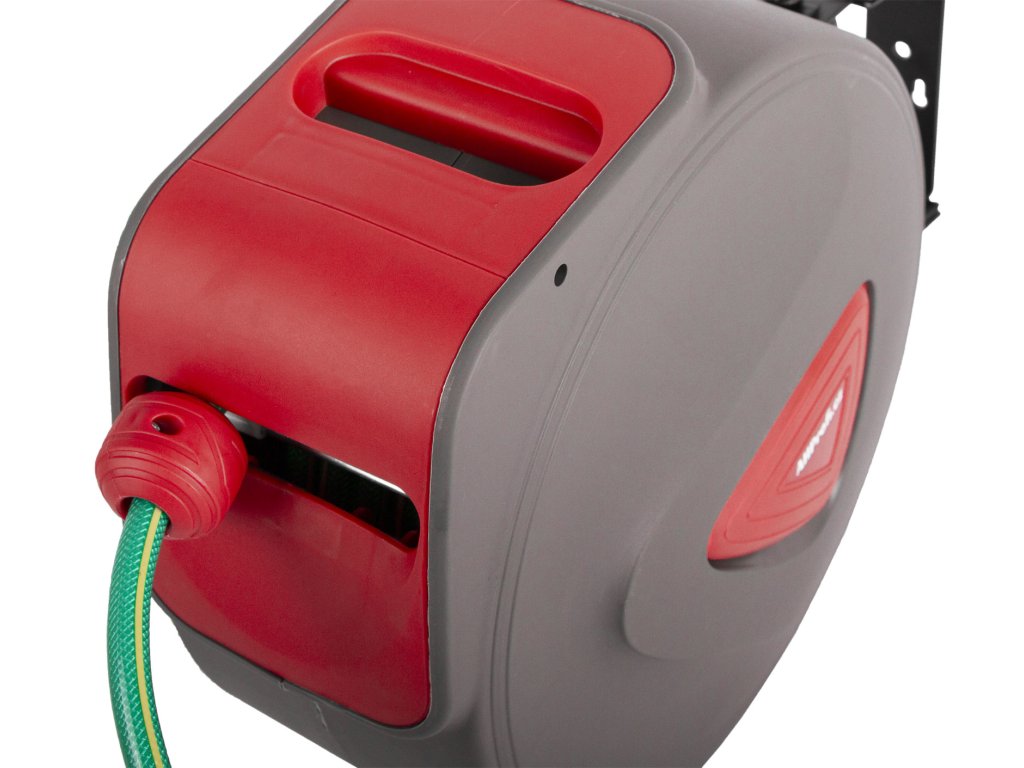 Otočný držák umožňuje montáž na stěnu, strop nebo jinou konstrukci, zatímco pevné madlo zajišťuje snadné přenášení. Navíjení hadice do bubnu prodlužuje její životnost a chrání ji před poškozením.