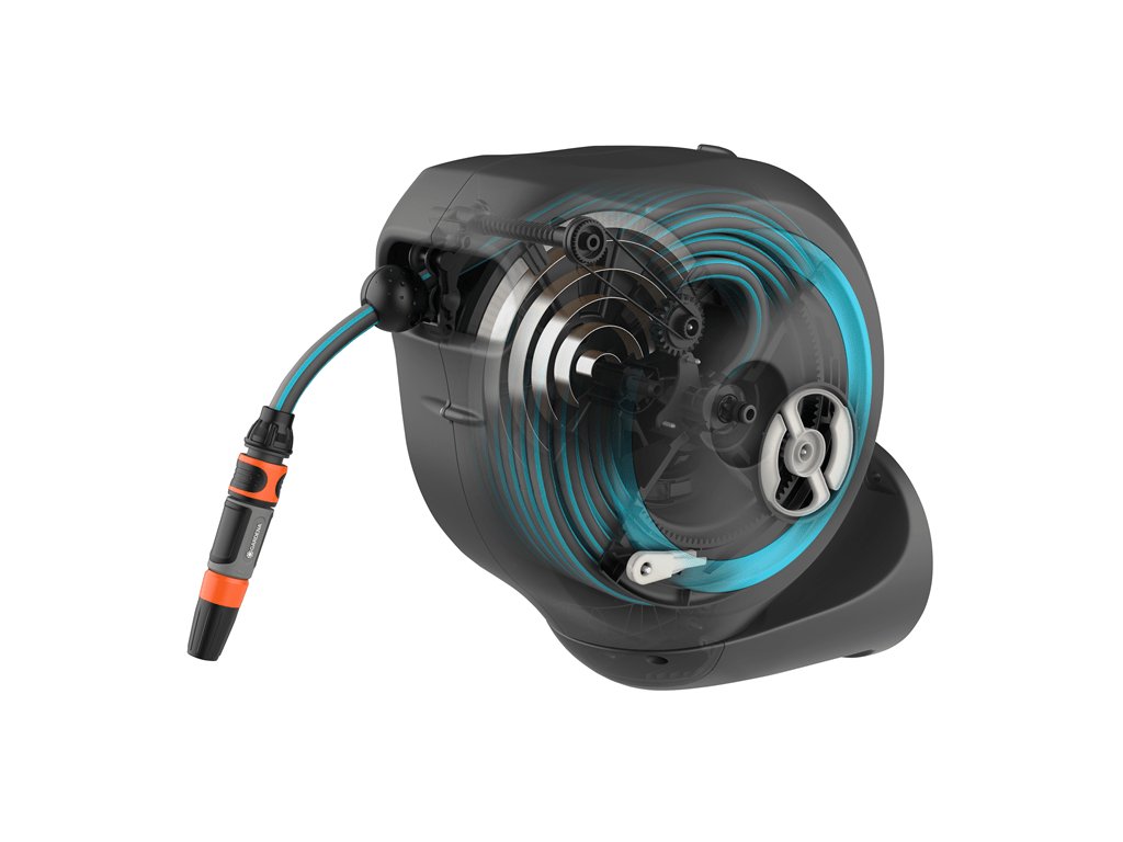 Lehkým zatažením za konec hadice se zámek uvolní a zabudovaná ocelová pružina s inovativní technologií RollControl navine plynule a kontrolovaně hadici zpět do boxu. RollControl chrání box na hadici a okolí před poškozením způsobeným příliš rychlým vtažením. Aby nedocházelo k zalomení nebo zauzlení hadice na vodu, disponuje box integrovaným vedením hadice.