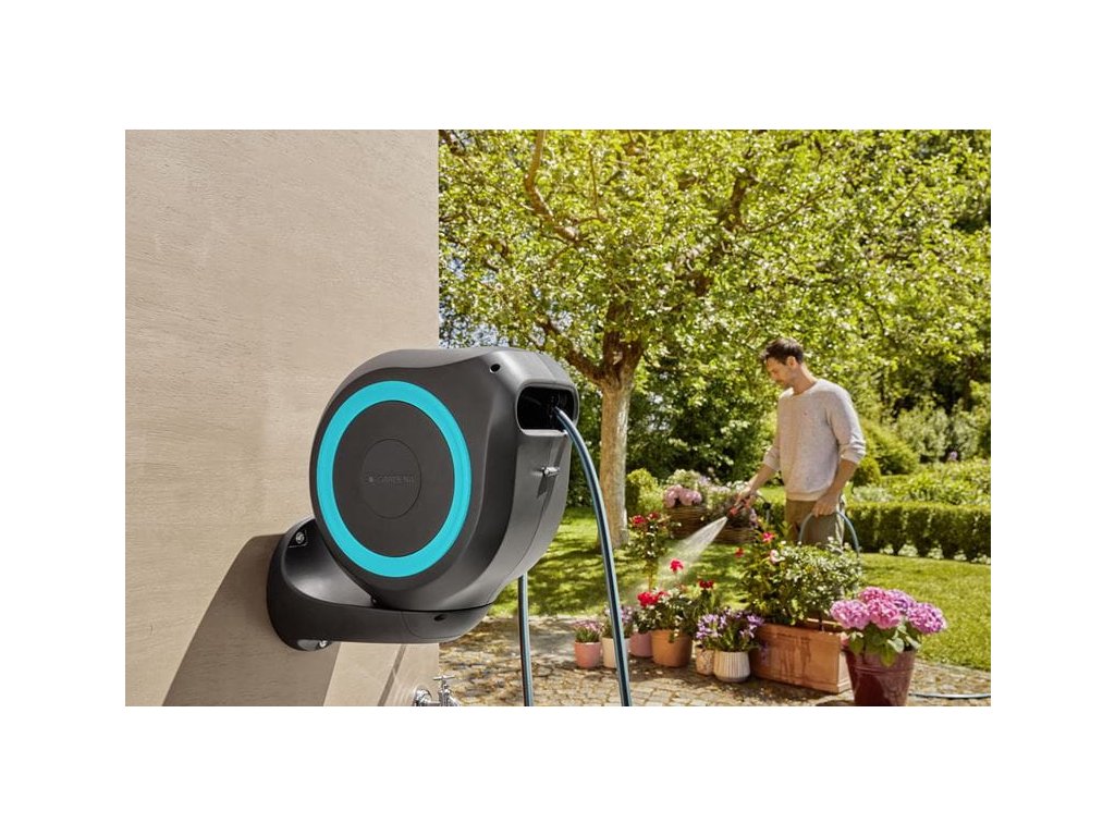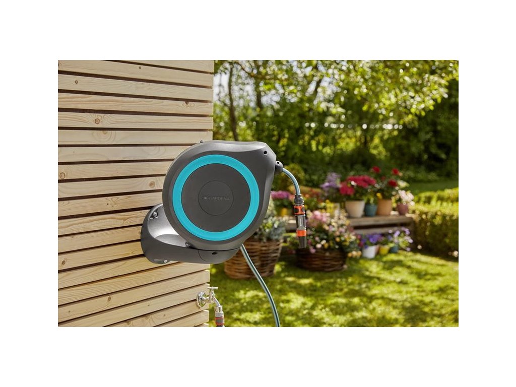 Robustní nástěnný držák umožňuje otáčet boxem na hadici o více než 180°, abyste se bez námahy dostali do všech koutů zahrady. Pro přímé použití jednoduše vytáhnete zahradní hadici na maximální délku 20 metrů. Zahradní hadice se po vytažení automaticky uzamyká po velmi krátkých vzdálenostech, a to znamená, že se s hadicí velmi snadno manipuluje.