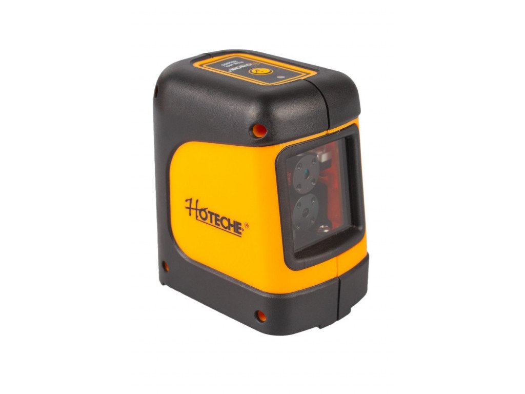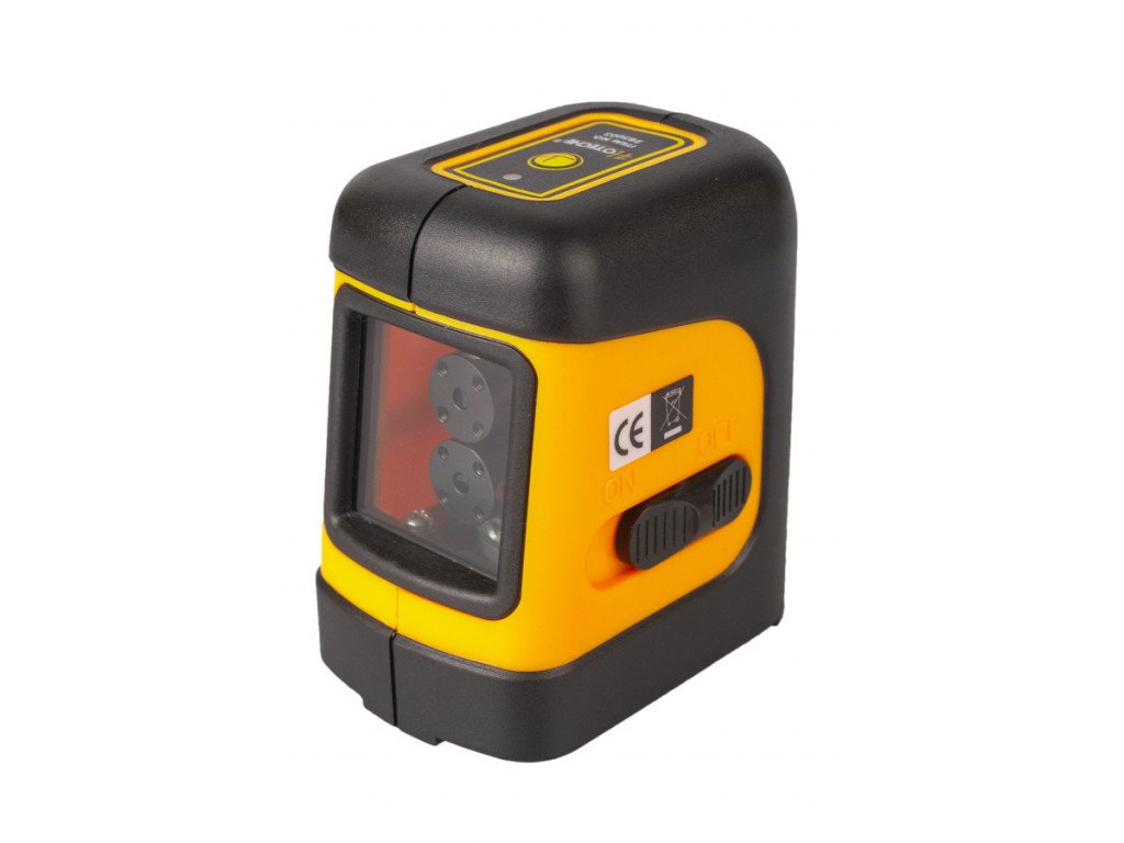 Samonivelační křížový laser s dvojicí červených paprsků (vodorovný, svislý) a maximálním pracovním dosahem až deset metrů.