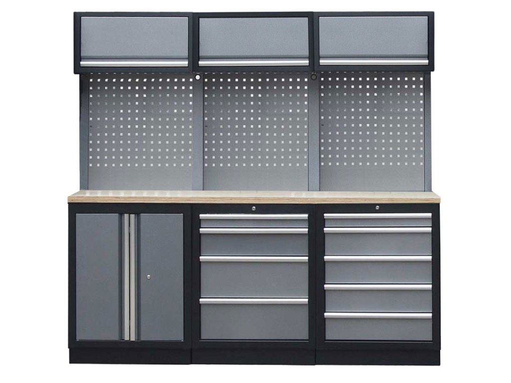Sestava nábytku v sobě skrývá dostatečné množství úložného prostoru pro vaše nářadí, autotechniku i dílenské vybavení. V kombinaci s bytelnou pracovní deskou získáte multifunkční stěnu, se kterou vám půjde práce od ruky ve všech směrech.