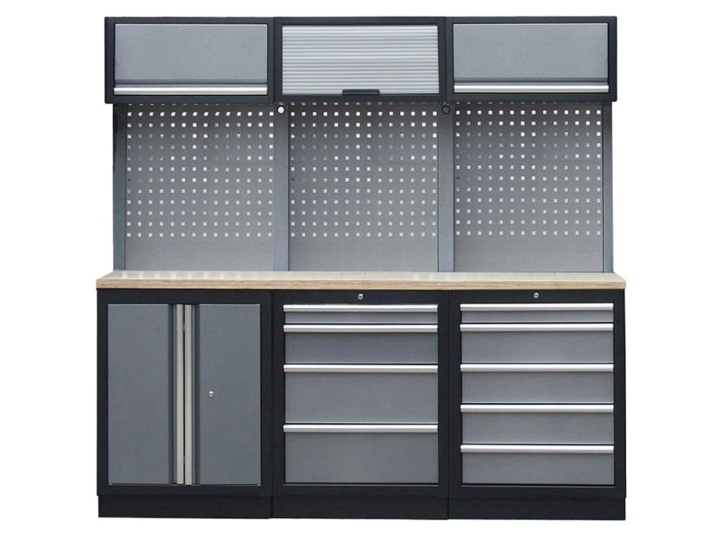 Sestava nábytku v sobě skrývá dostatečné množství úložného prostoru pro vaše nářadí, autotechniku i dílenské vybavení. V kombinaci s bytelnou pracovní deskou získáte multifunkční stěnu, se kterou vám půjde práce od ruky ve všech směrech.