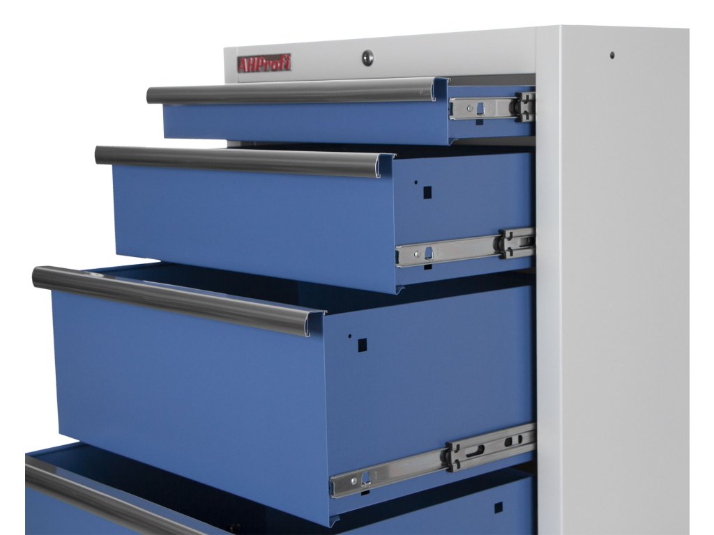 Zásuvky dílenského nábytku PROFI mají vysoce kvalitní pojezdy s kuličkovými ložisky, které poskytují plynulost a přesnost pojezdu zásuvek i při plném zatížení. Max. nosnost zásuvky činí 30 kg.