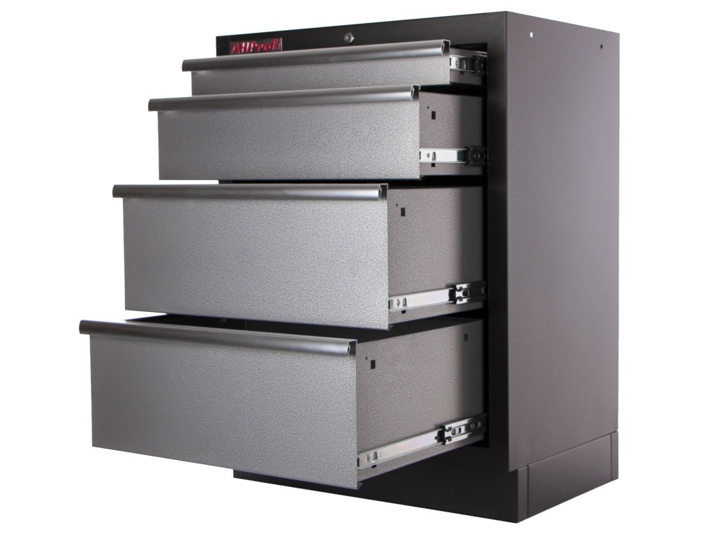 Zásuvky dílenského nábytku PROFI mají vysoce kvalitní pojezdy s kuličkovými ložisky, které poskytují plynulost a přesnost pojezdu zásuvek i při plném zatížení. Max. nosnost zásuvky činí 30 kg.