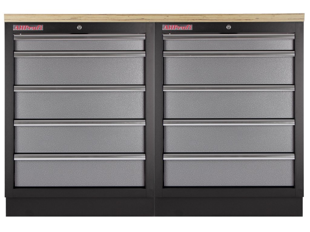 Dílenský nábytek PROFI GREY s dřevěnou deskou zaujme moderním a profesionálním vzhledem. Kombinace kladívkové šedé a černé RAL 9004 se bude vyjímat v každé garáži i dílně.