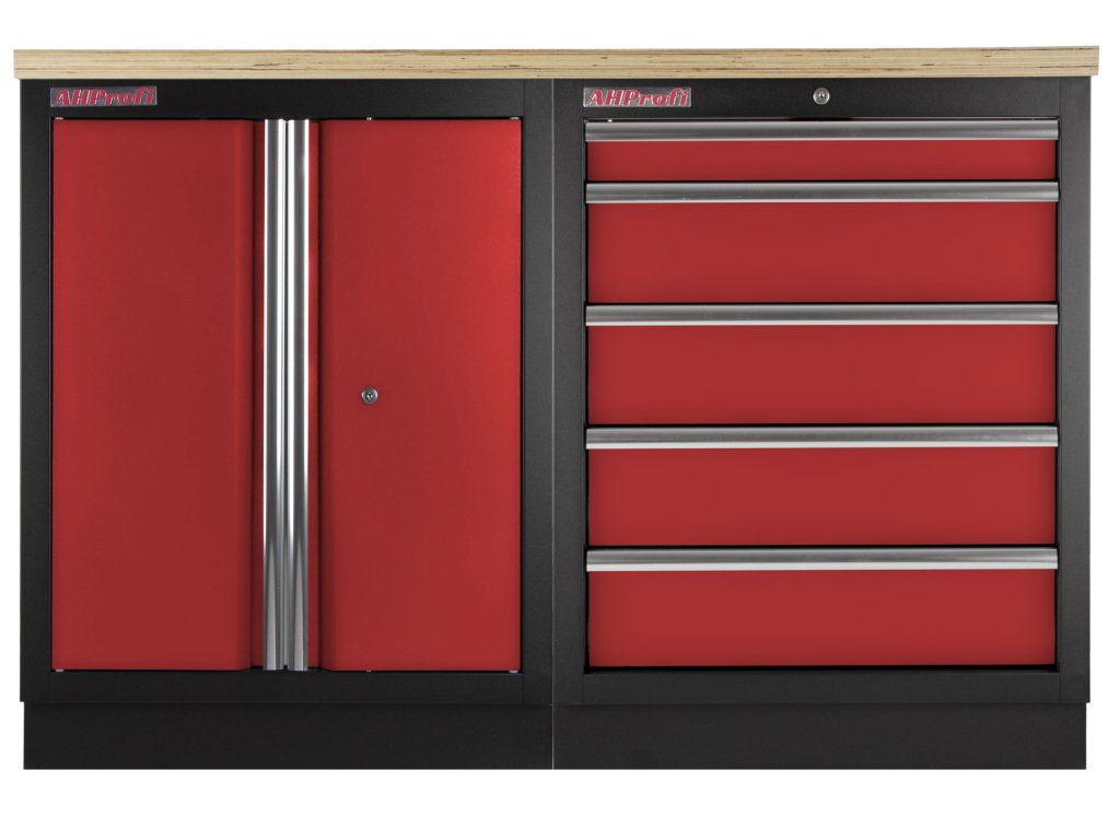 Dílenský nábytek PROFI RED s dřevěnou deskou zaujme moderním a profesionálním vzhledem. Kombinace červené RAL 3031 a černé RAL 9004 se bude vyjímat v každé garáži i dílně.