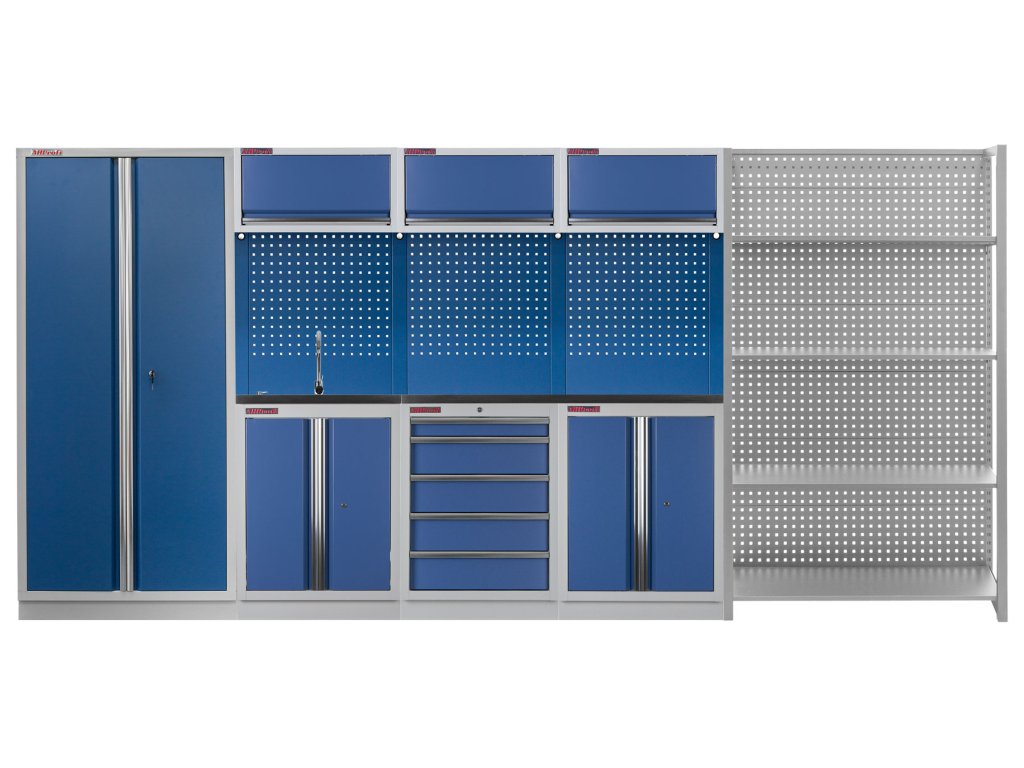 Sestava dílenského nábytku ve vysoké kvalitě, který je vhodný pro profesionální servisy i domácí garáže a dílny. Nábytek je celokovový s kovovou pracovní deskou. Sestava 16 ks dílenského nábytku udrží nářadí přehledně uklizené na správném místě.