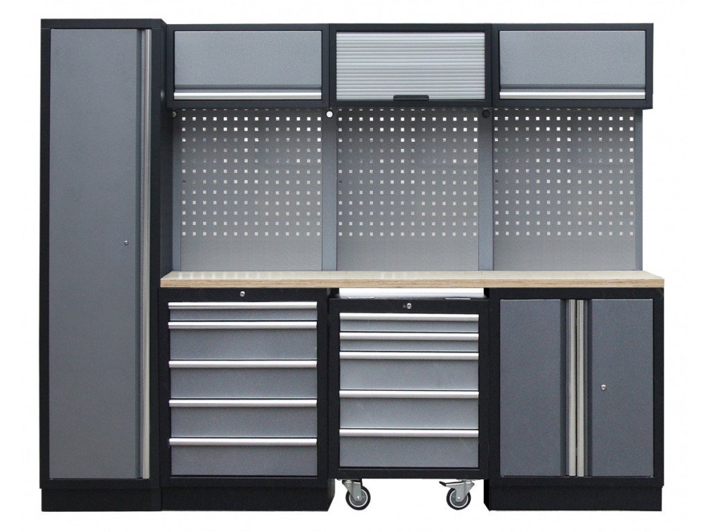 Sestava dílenského nábytku ve vysoké kvalitě, který je vhodný pro profesionální servisy i domácí garáže a dílny. Nábytek je celokovový s dřevěnou pracovní deskou. Sestava 15 ks dílenského nábytku udrží nářadí přehledně uklizené na správném místě.