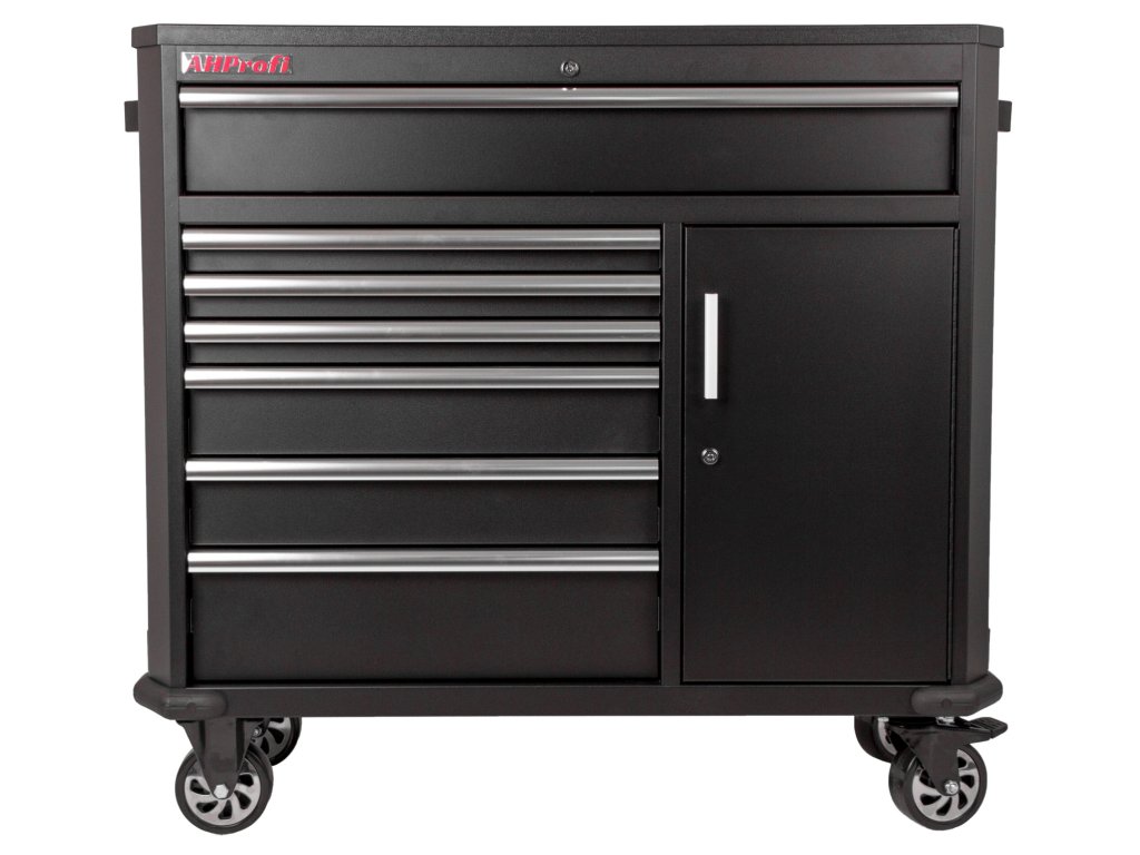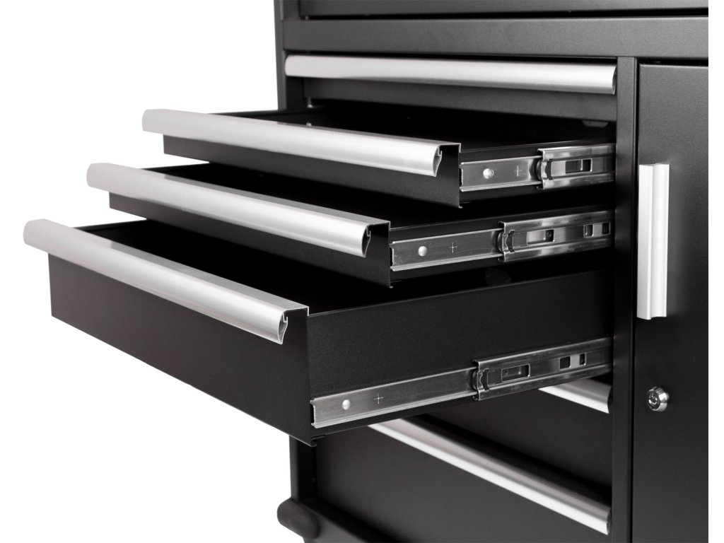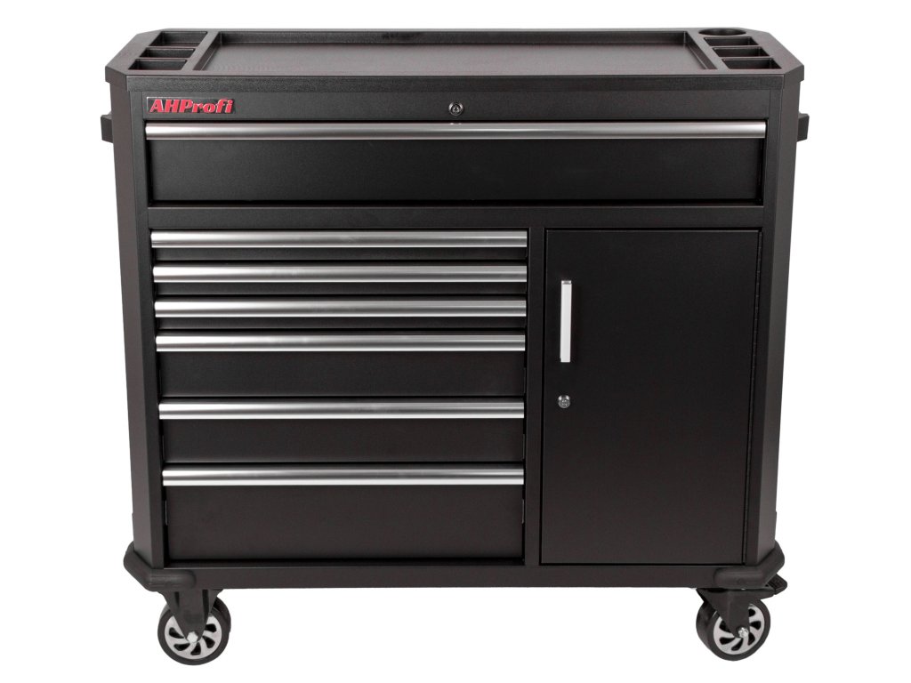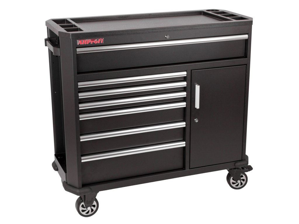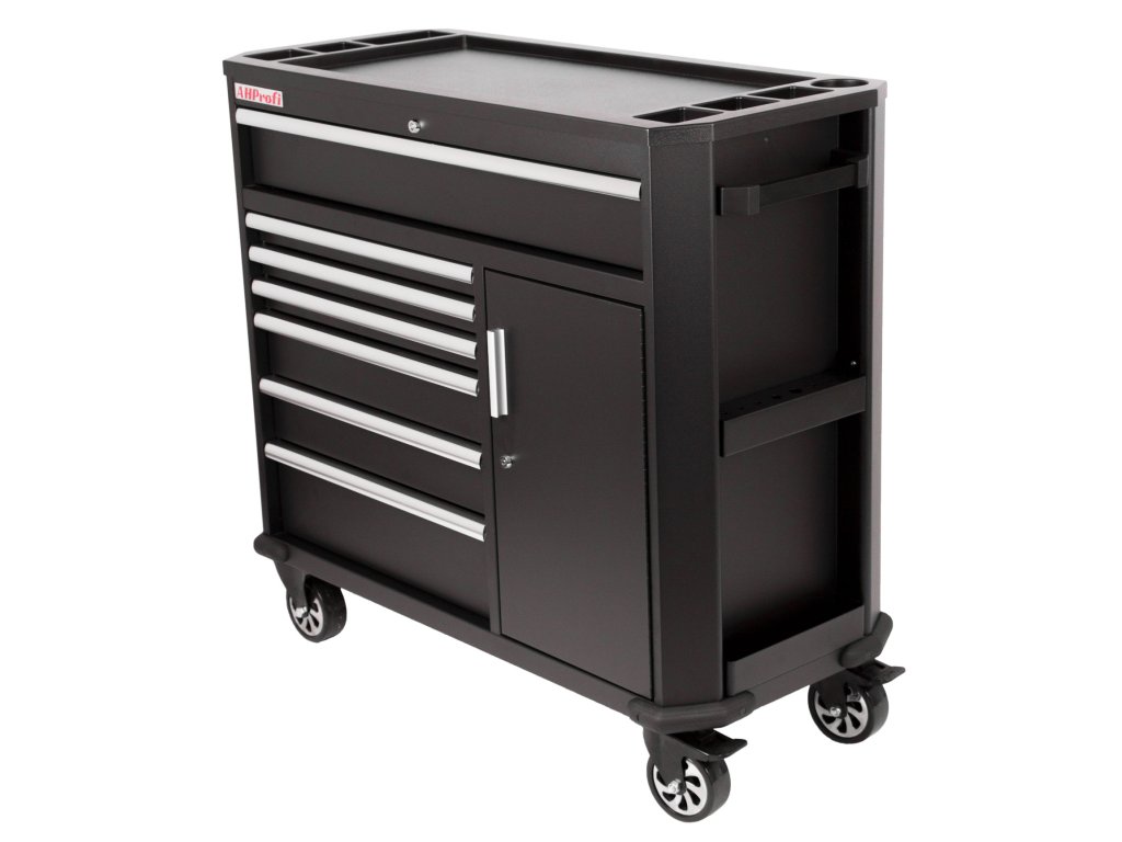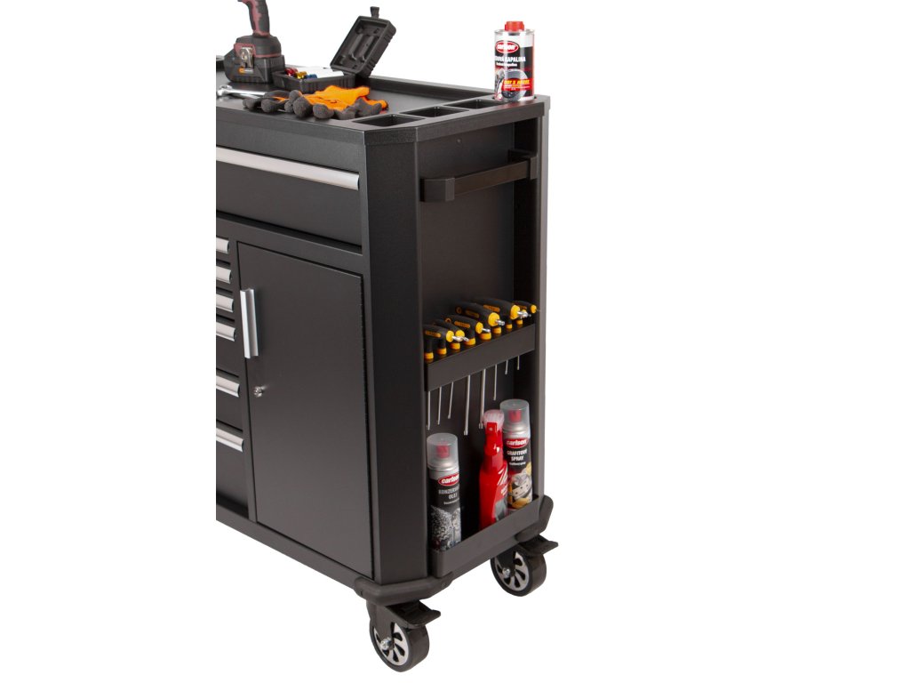 Černý široký kovový dílenský vozík se 7 šuplíky, skříňkou s nastavitelnou poličkou a bočním odkládacím prostorem je vybavený nezbytným nářadím pro práci v dílně.