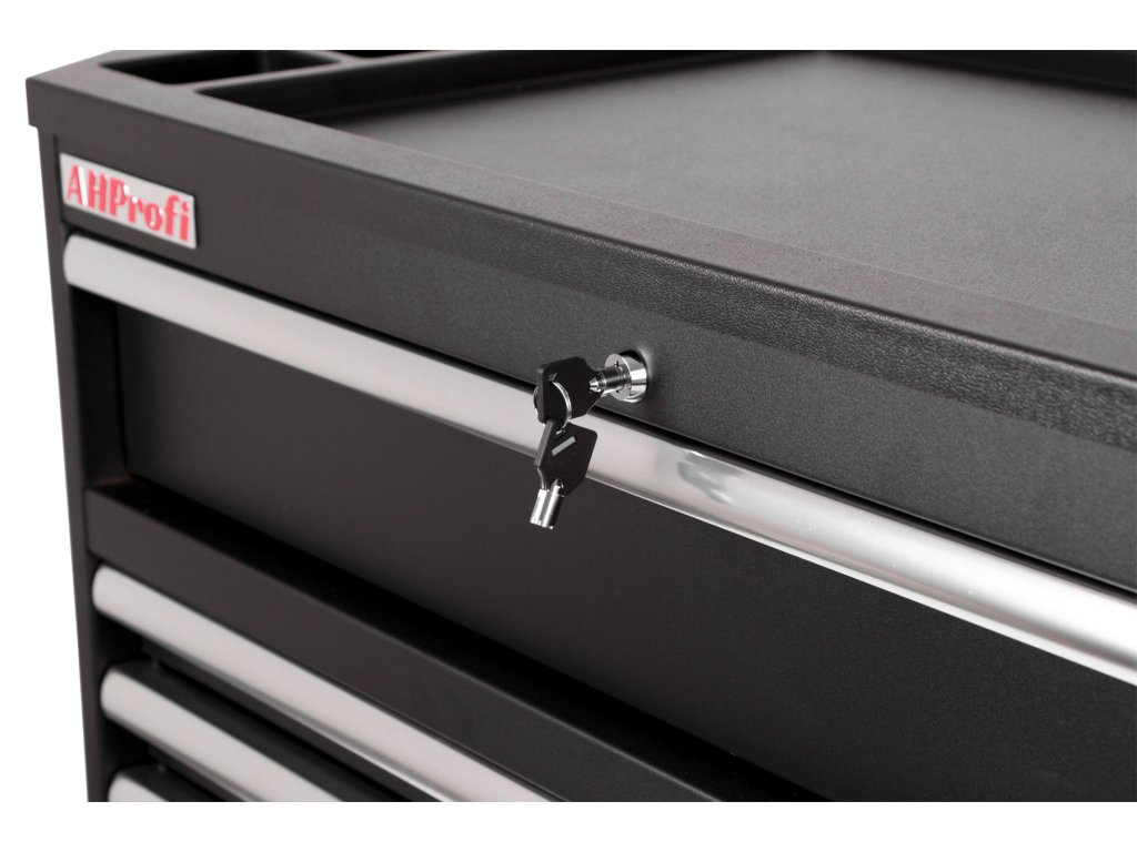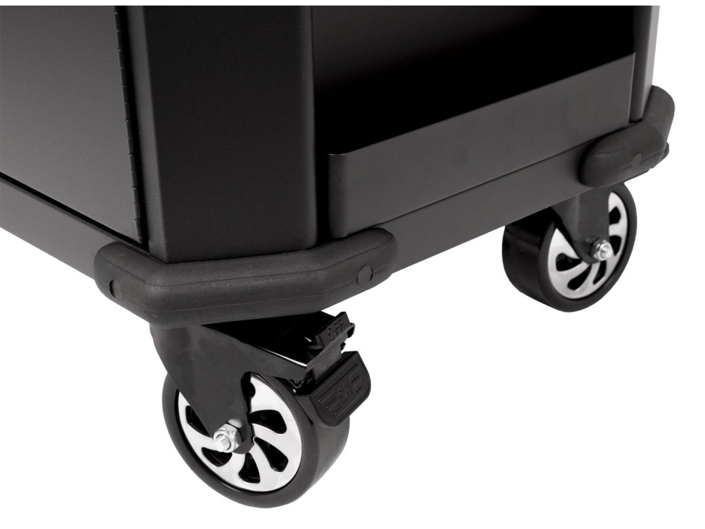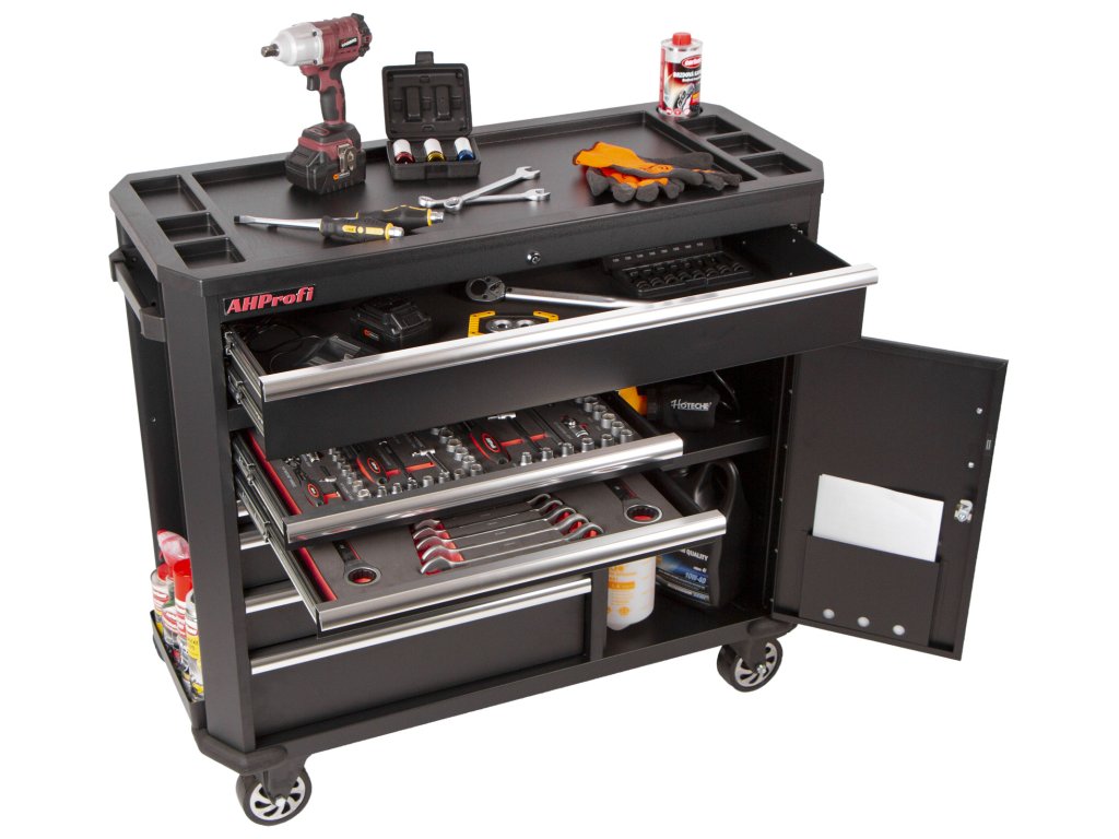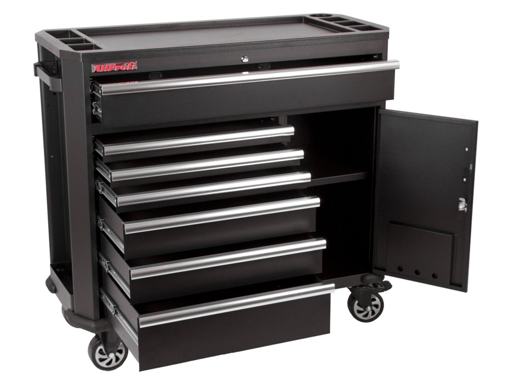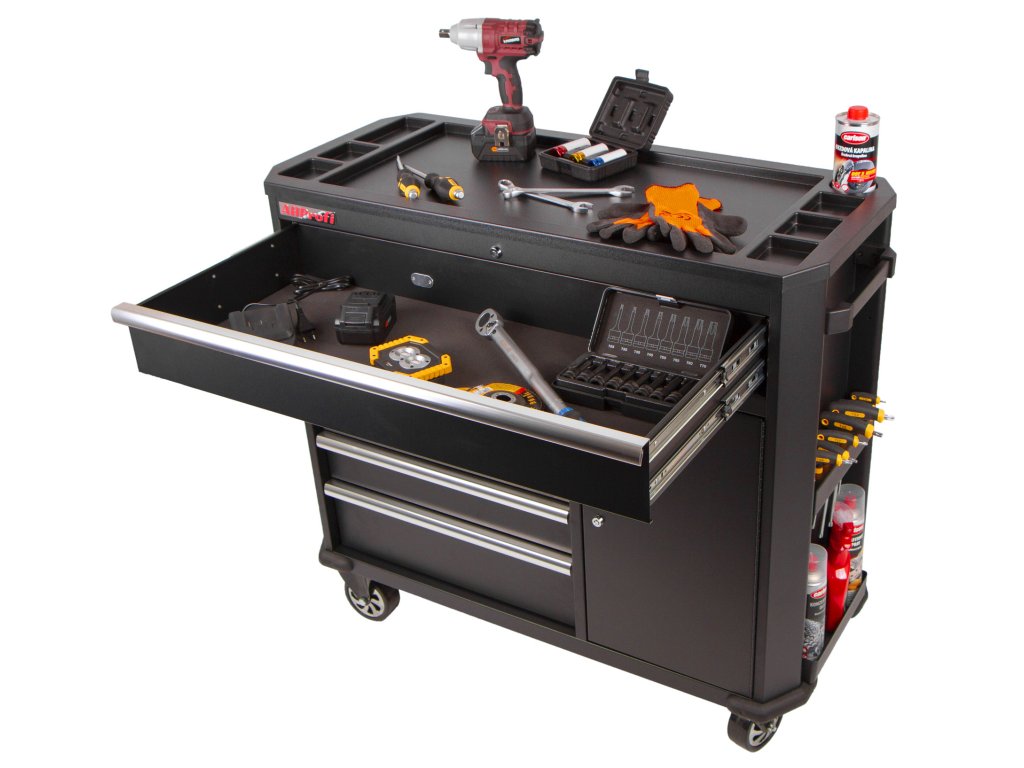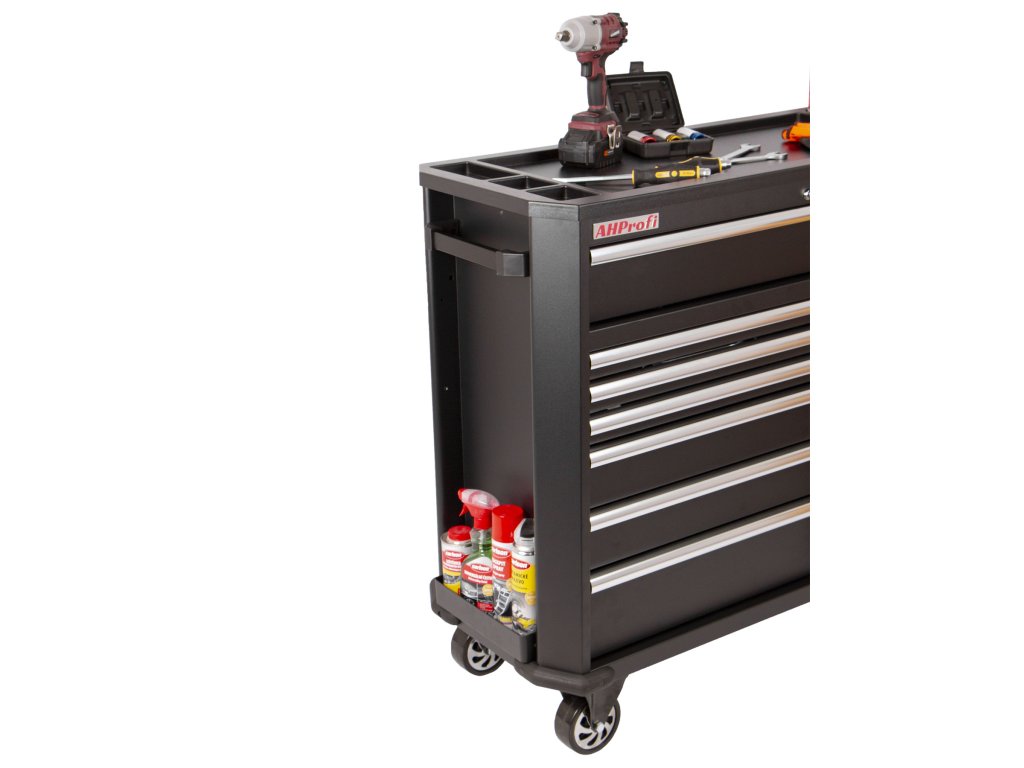 Černý široký kovový dílenský vozík se 7 šuplíky, skříňkou s nastavitelnou poličkou a bočním odkládacím prostorem je vybavený nezbytným nářadím pro práci v dílně.
