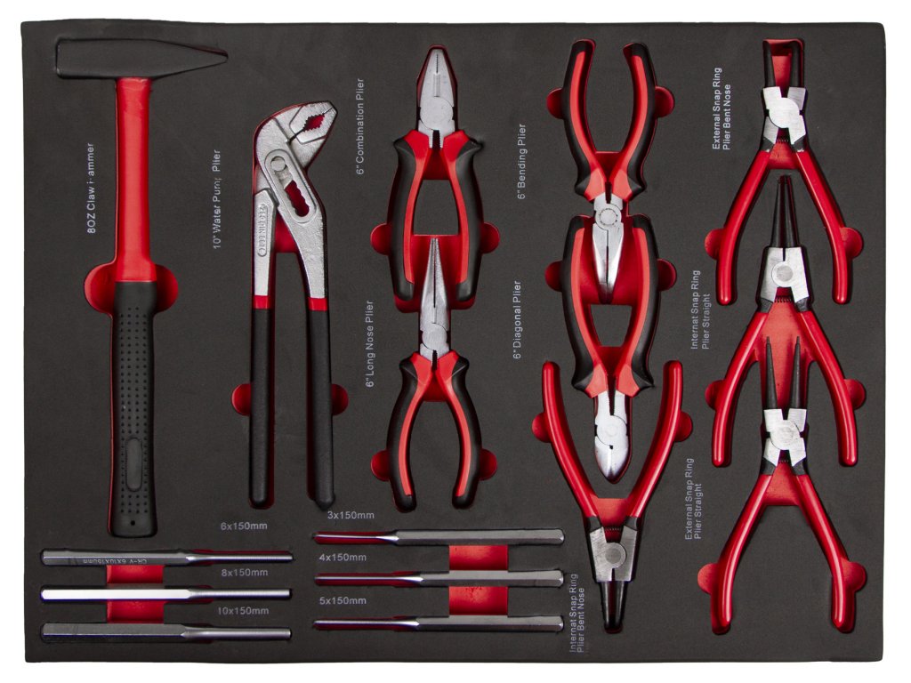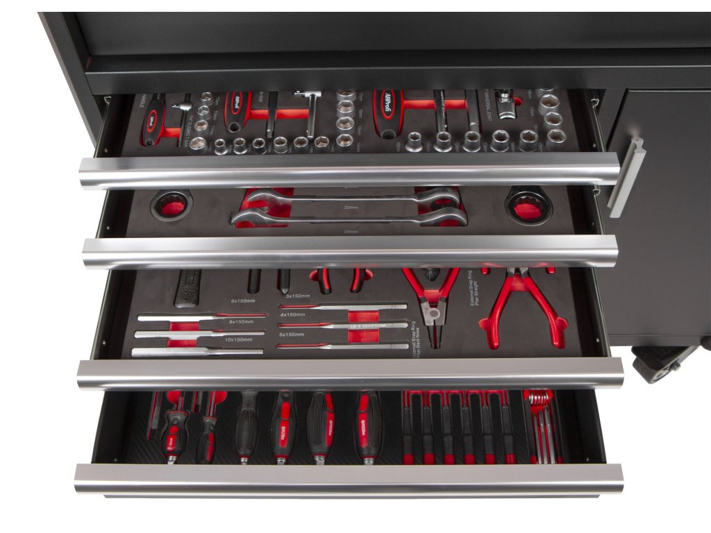 Vozík obsahuje 4 pěnové výplně s nářadím.