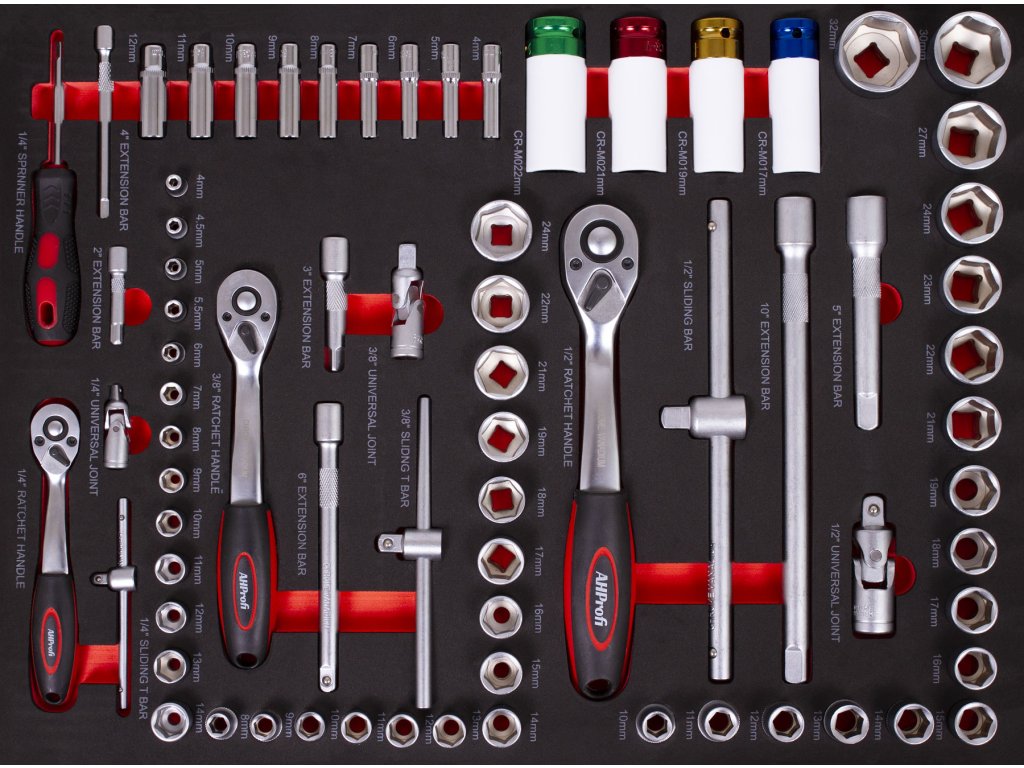 | 17 ks | Nástrčné klíče 1/2": 10; 11; 12; 13; 14; 15; 16; 17; 18; 19; 21; 22; 23; 24; 27; 30 a 32 mm. |
