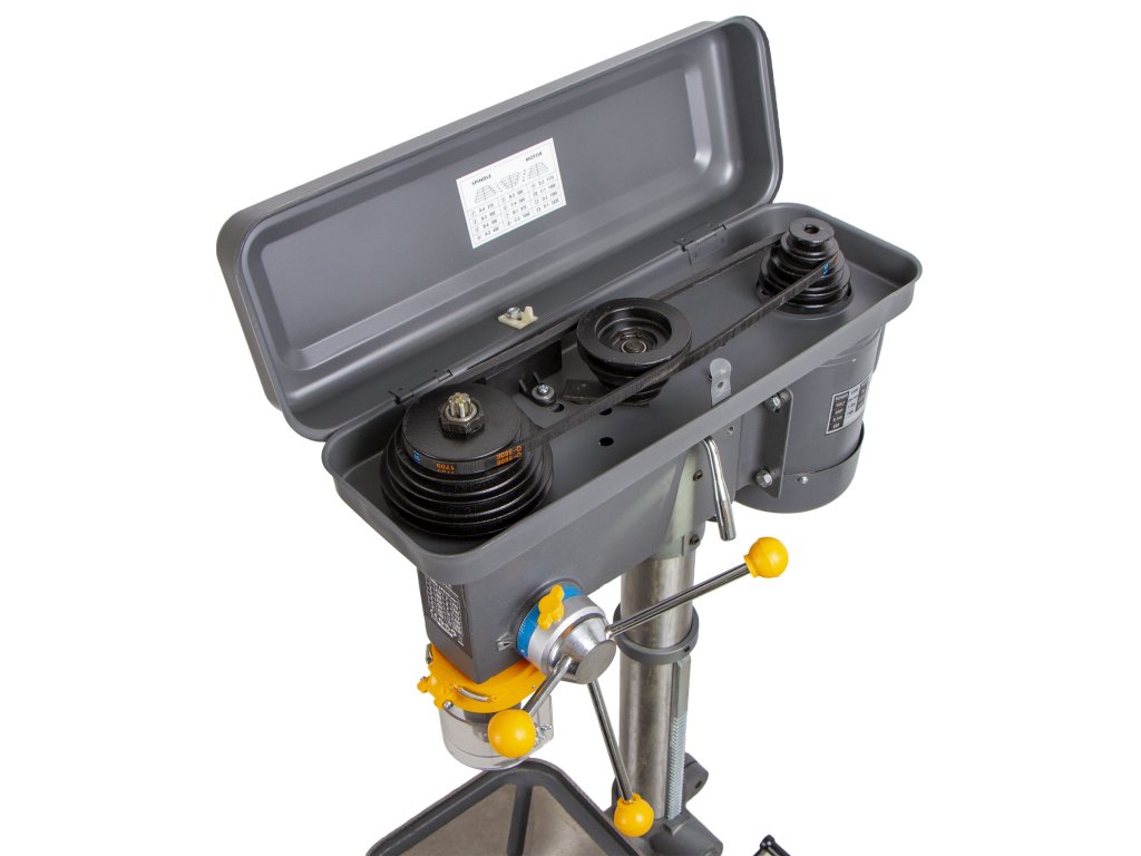 V horní části sloupu se nachází hlava stojanové vrtačky, která sobě ukrývá motor, vřeteník s převody otáček a upínací hlava s tříčelisťovým zubovým sklíčidlem s možností uchycení vrtáků až do 16 mm.