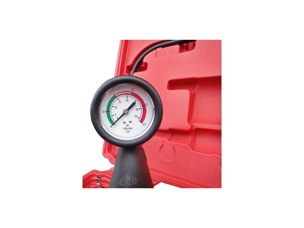 Po výběru vhodného adaptérů a jeho zašroubování ke chladící soustavě připojíme pumpičku a natlakujeme na 10 - 15 psi nebo podle specifikace výrobce vozu a sledujeme zda tlak neklesá.