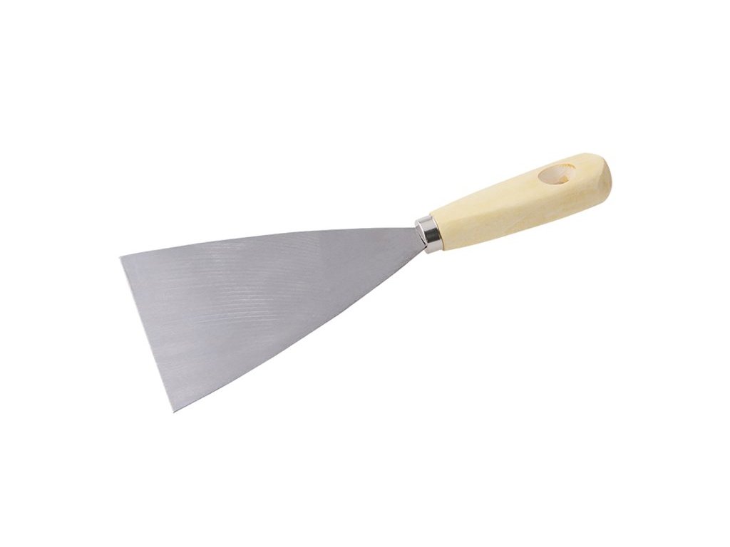 Špachtle ocelová 100 mm s dřevěnou ručkou. Špachtle se používá k nanášení a roztírání stavební sádry, tmelů nebo k očištění a odstranění starých tmelů, maleb či tapet. Díky trojúhelníkovému tvaru se materiál velmi snadno nanáší i odstraňuje.Doplňkové parametry
