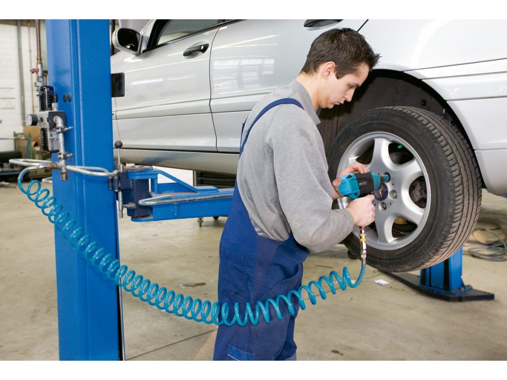 Pro urychlení práce s pneumatickým nářadím je vzduchová hadice z obou stran zakončena rychloupínacími spojkami.