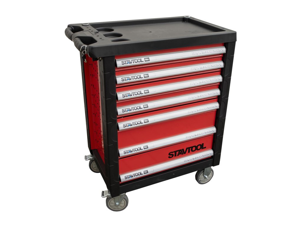 Kovový montážní vozík na nářadí se 7 zásuvkami. Dvě pevná a dvě otočná kola s poziční brzdou. Zásuvky s kuličkovými ložisky lze vysunout do 40 cm. Horní pracovní plocha i zásuvky jsou vypodloženy protiskluzovou podložkou. Držadlo pro manipulaci s vozíkem lze umístit z pravé i levé strany. Součástí je 5 nízkých a 2 vysoké uzamykatelné zásuvky.Doplňkové parametry