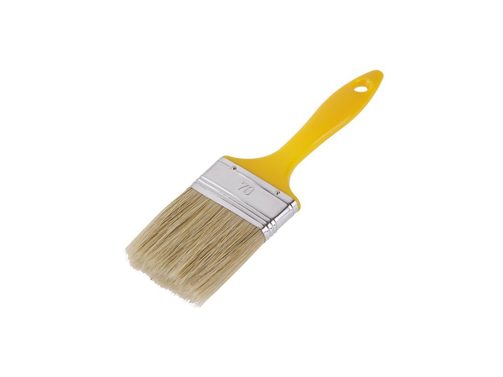 Štětec plochý 70x15x65mm se žlutým plastovým držadlem, světlá štětina - tato štětina se získává z čínských prasat v barevném provedení světlá, černá a šedá. Hmotnost 0,093 kg.Doplňkové parametry