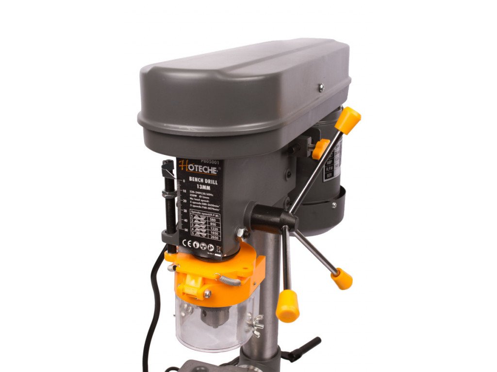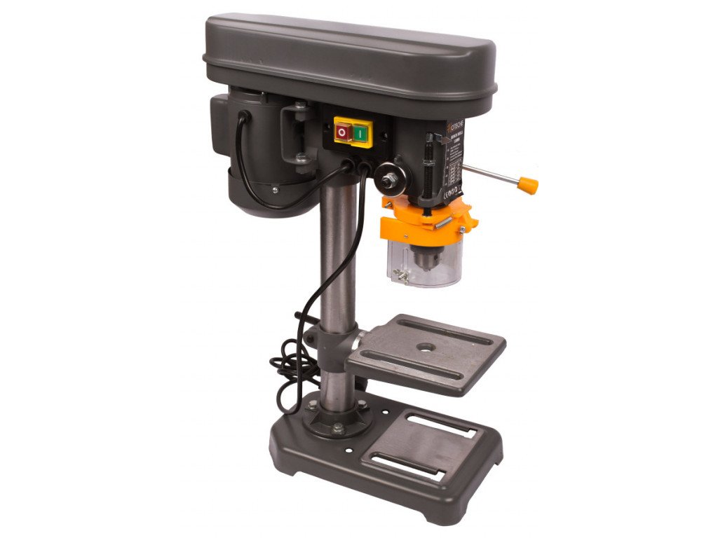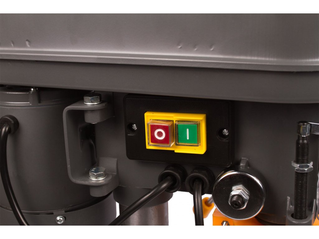 Ze základny vystupuje masivní stojanová tyč, na kterou je pomocí rychloupínací kličky uchycen upínací stůl obrobku, který můžete poklopit +-40°. Shora je pak na stojanovou tyč nasazena hlava stojanové vrtačky, která v sobě ukrývá vřeteník s převody otáček, vřeteno se tříčelisťovým zubovým sklíčidlem s možností uchycení vrtáků 1 - 13 mm. Svislý pohyb vřetena je zajištěno posuvovou pákou. Ke zvýšení bezpečnosti práce pomáhá výklopný bezpečnostní kryt sklíčidla, který Vás ochrání od možného odlítnutí špony a tím újmě na zdraví. Svislý posuv sklíčidla je možné omezit za pomoci závitové distanční hřídele s měřítkem.