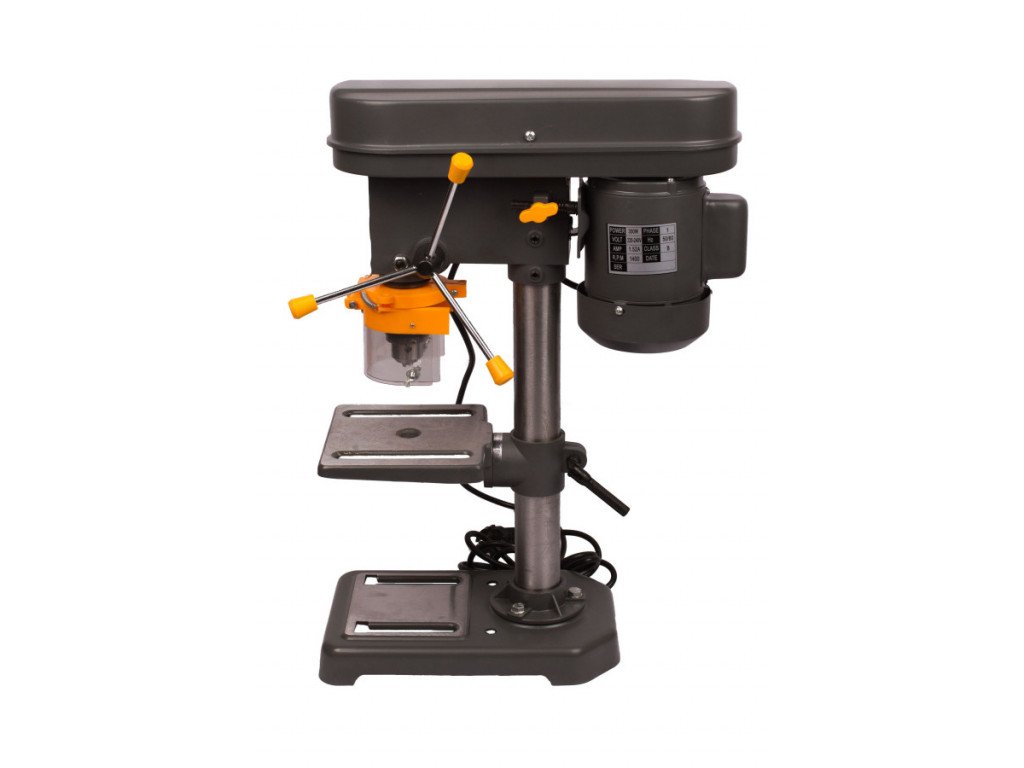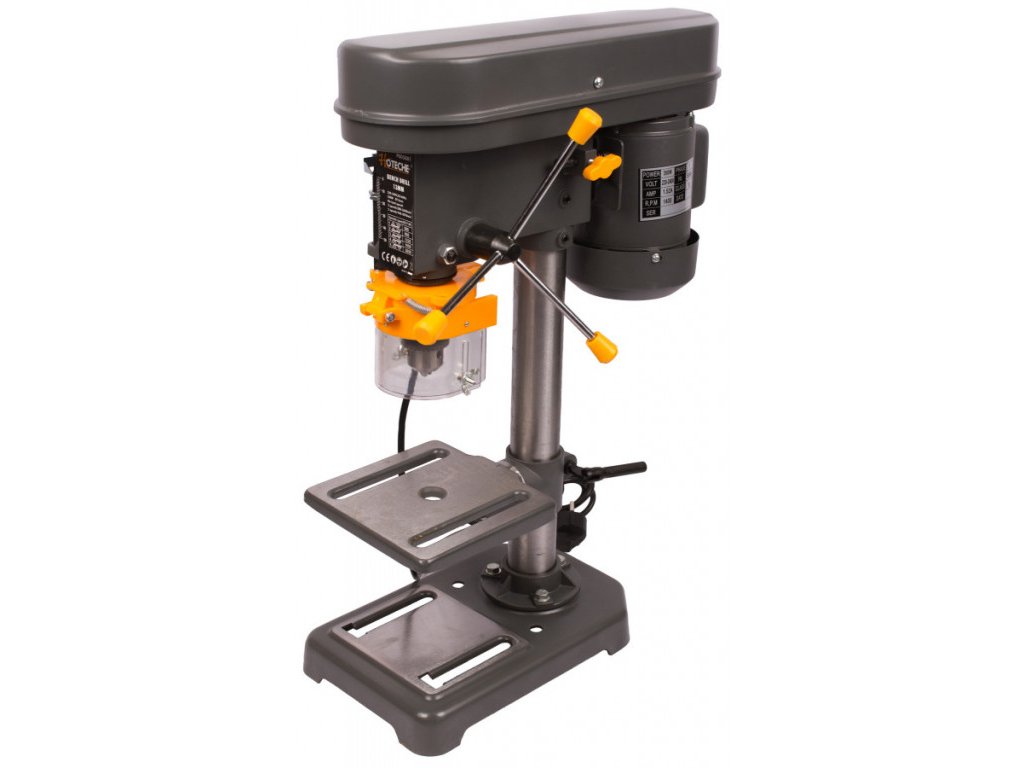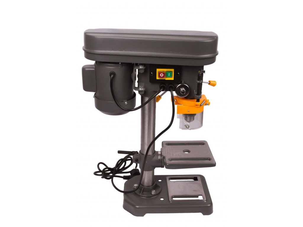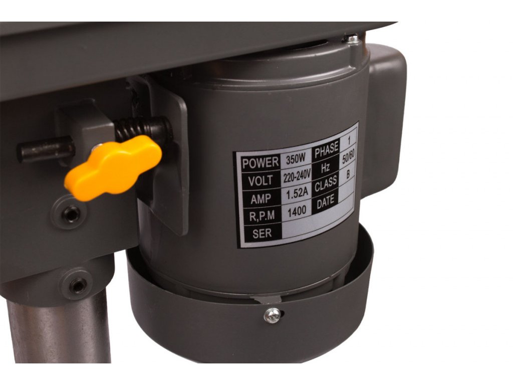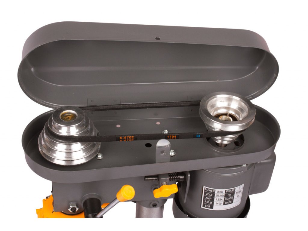 Praktická stolní stojanová vrtačka, určená k vrtání kovů, dřeva nebo plastů pro domácí hobby dílny. Vrtačka má výkon 350W, který lze zpřevodovat do 5 rychlostních stupňů. Rychlostní stupně nastavujeme za pomoci klínového řemene, upnutého v hlavě vrtačky (Vřeteníku) mezi kola s různými průměry. Možné rychlostní stupně: 580 / 850 / 1220 / 1650 / 2650 ot. za min. naprázdno.