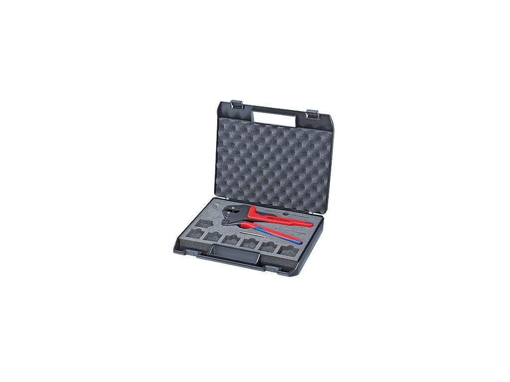 - V plastovém kufříku, pěnová vložka s prohlubněmi pro ukládání krimpovacích nástavců a polohovacích přípravků- s montážním nářadím (inbusový klíč), šrouby a matkami