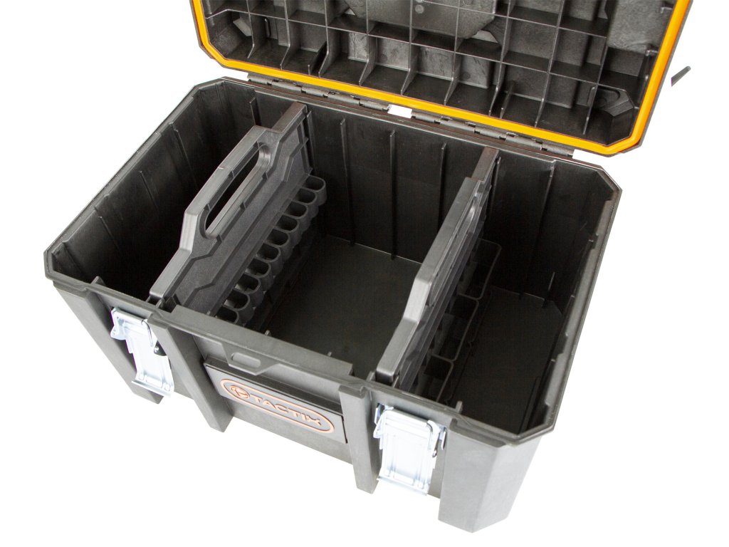 - Odolné hliníkové západky pro bezpečné uzavírání organizéru.