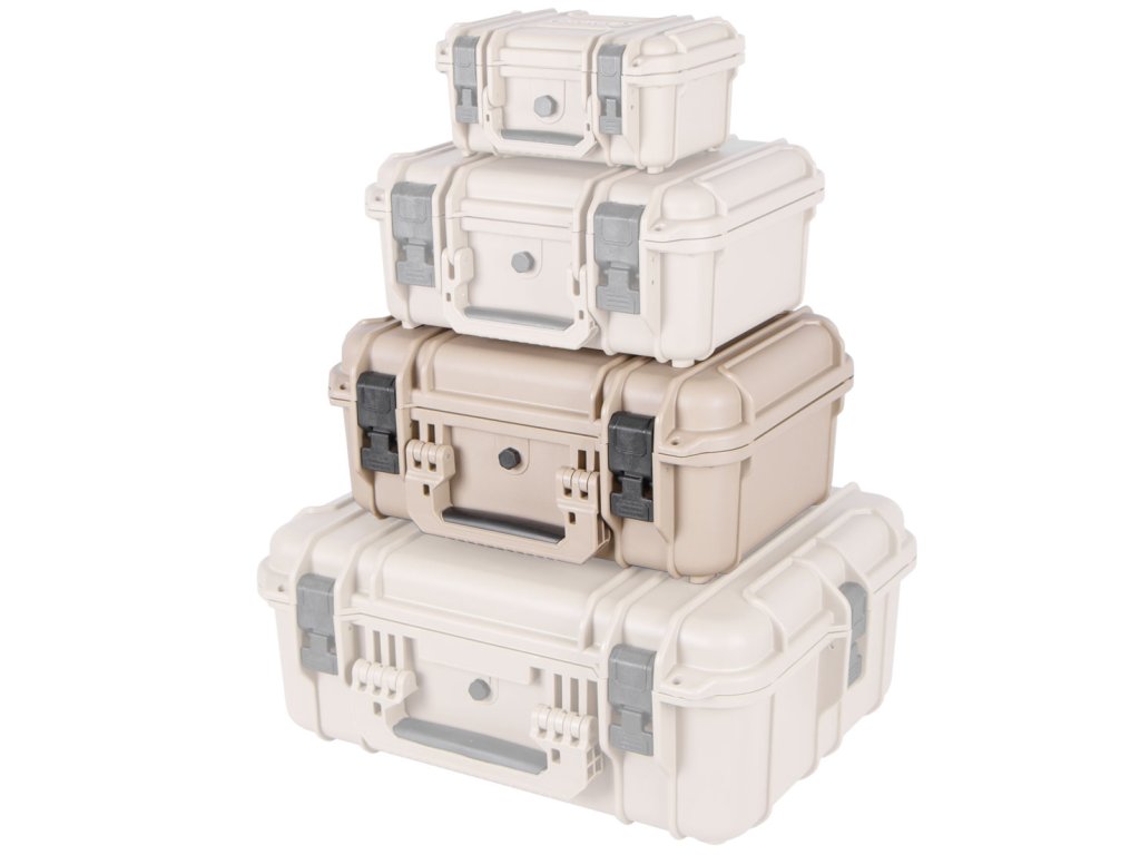 Vodotěsný plastový kufr v pískové barvě, pro různé druhy křehkého nářadí a vybavení.