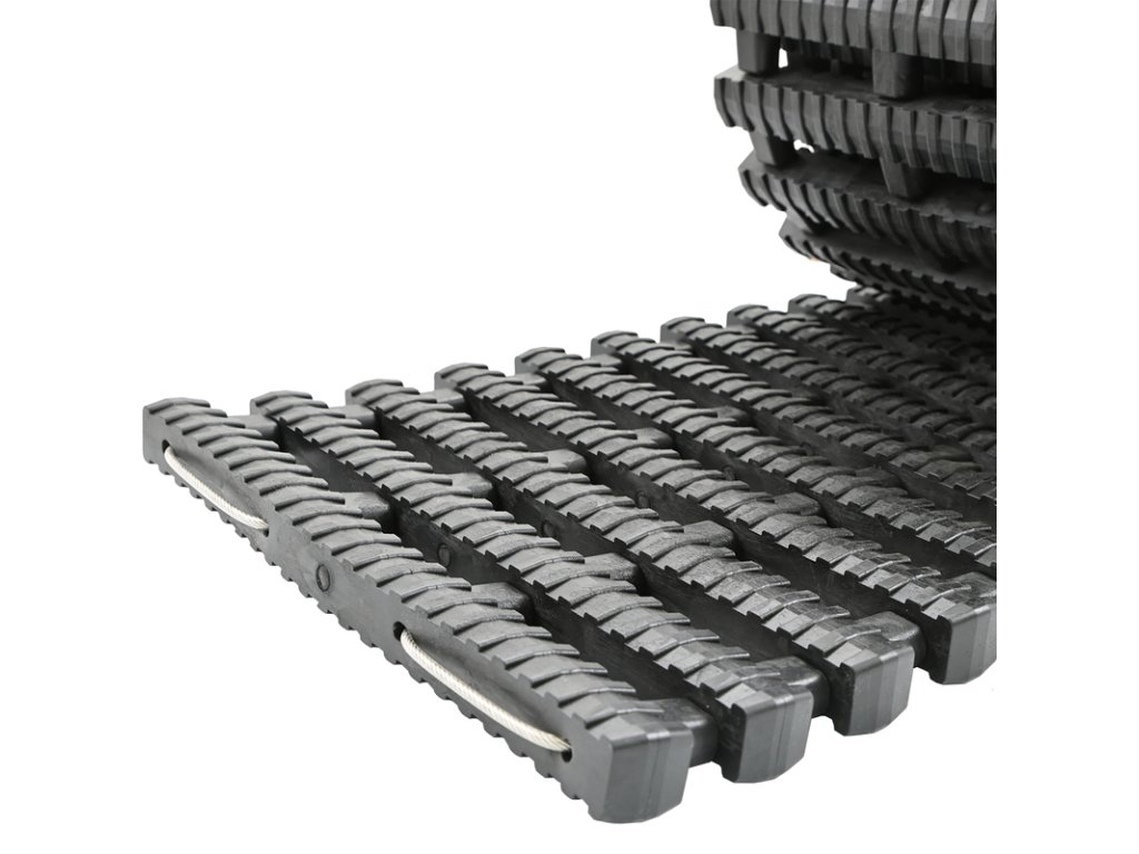 Pás je vyroben z kvalitní oceli a tvrzené gumy. Kombinace pevných gumových hranolů spojených ocelovým lanem zajišťuje pevnost a dostatečnou trakci pro vyprošťované vozidlo. Pro vaše pohodlí a snadné skladování přímo v automobilu v balení naleznete také praktickou tašku na srolování pásu.