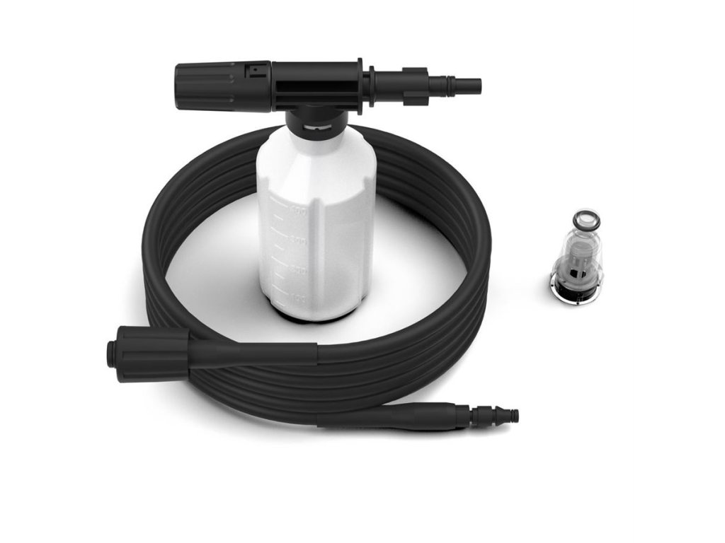 Příslušenství: nastavitelná VARIO tryska, rotační tryska na úporné nečistoty, pěnový postřikovač s nádobkou, hadicová přípojka vč. vodního filtru, 5 m tlaková hadice.
