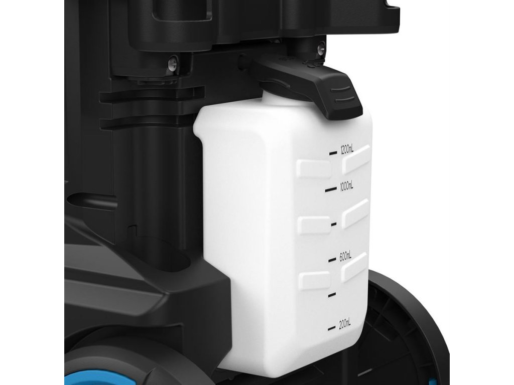 Konstrukce: plášť z tvrzeného plastu, praktické držáky příslušenství, hák k zavěšení elektrického kabelu, naviják tlakové hadice, integrovaný zásobník na čisticí přípravky.