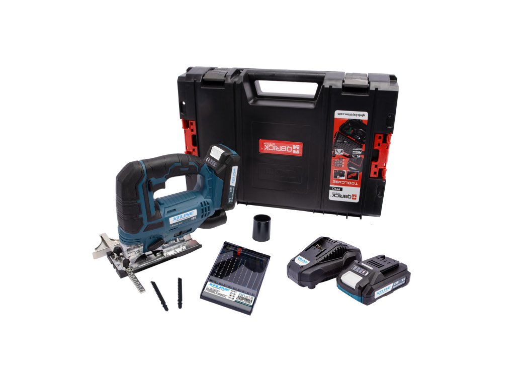 XTLINE Aku přímočará pila 18 V + 2 baterie 2.0 Ah + nabíječka 2.4 A + pilové plátky + box
