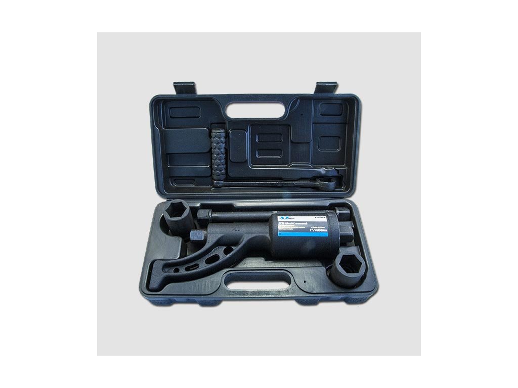 Profesionální násobič momentu pro zásadní zvýšení točivého momentu při povolování kol nákladních automobilů a autobusů. Vhodný pro uvolňování zarezlých a příliš utažených šroubů. Výstupní čtyřhran 1”, utahovací moment lze regulovat, uloženo s hlavicemi v plastovém kufru. Čtyřhran pro nasazení hlavice, páka pro zapření o rám kola vyvine velký povolovací moment pomocí malé ruční síly. Výbava - 1’ hlavice 32 a 33 mm, prodlužující nástavec.Doplňkové parametry