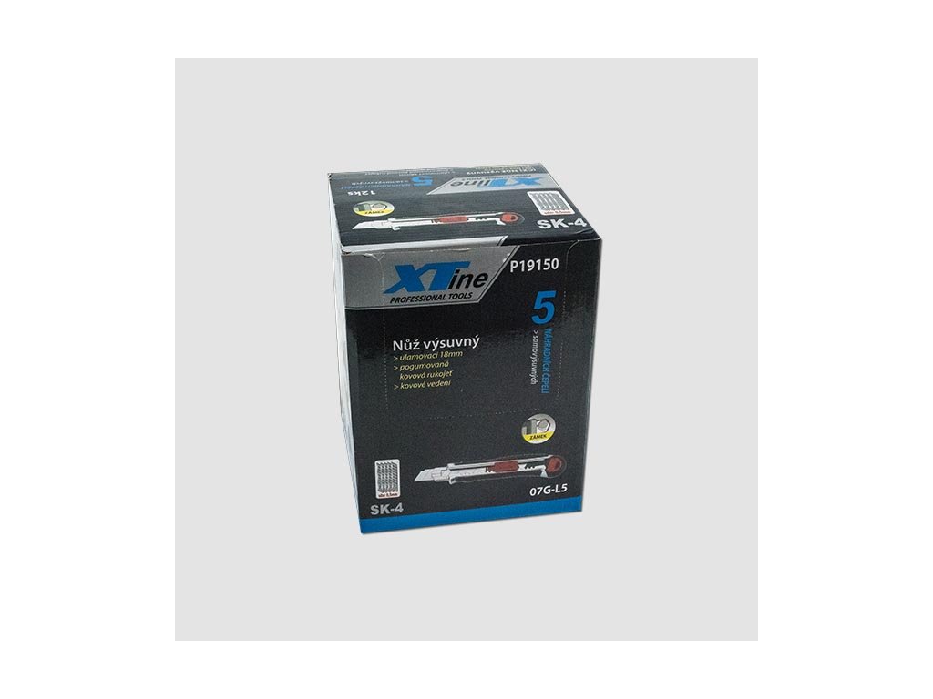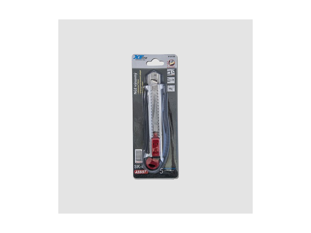 Celokovový ulamovací nůž s kovovou vodící lištou a pryžovým pláštěm. Ocelové vodítko čepele se vždy automaticky uzamkne proti pohybu a umožňuje rychlou výměnu náhradní čepele přímo ze zásobníku. Pogumovaná rukojeť s drážkami proti prokluzu. Vysouvač slouží jako zámek a rychlé výměně břitu. Vysouvací zásobník s 5 náhradními čepelemi.Doplňkové parametry