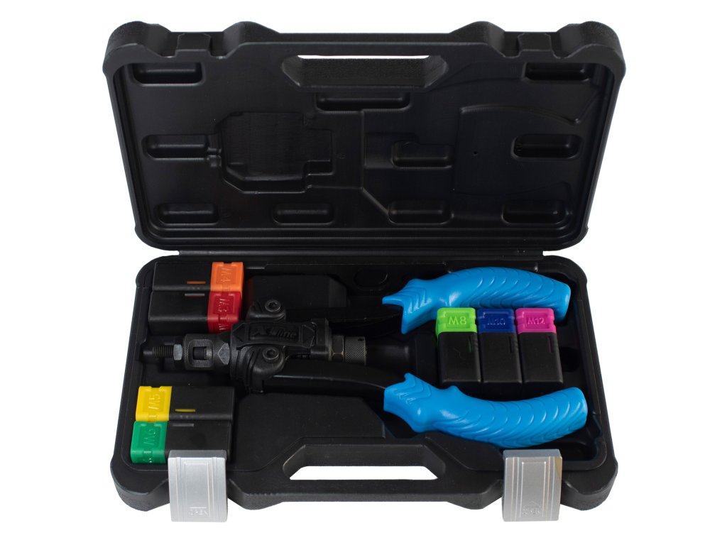 Nýtovací litinové kleště mají vysokotvrzenou ergonomickou konstrukci, jež je určena do těžkých provozů. Ocelová páka kleští a tvarovaná rukojeť snižují vynaložené úsilí při nýtování. Komfort při práci zajišťuje odolné lehké tělo z hliníkové slitiny, tvrzené Cr-Mo čelisti, koncovky pro maticové nýty M3, M4, M5, M6, M8, M10, M12 a klíč pro výměnu koncovek. Kleště jsou v plastovém boxu s nýtovacími nástavci.Doplňkové parametry