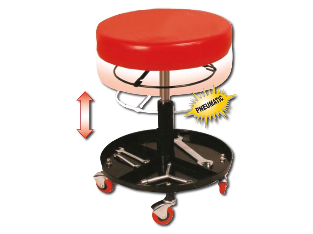 Dílenský pojízdný sedák s polstrováním. Nastavitelná výška v rozsahu 120 mm pomocí pneumatického pístu. Otáčecí sedák a řiditelná kolečka pro pohyb bez nutnosti vstát. Úložná plocha je praktická pro odkládání nářadí při práci.Doplňkové parametry