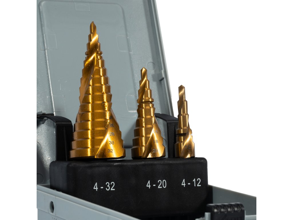 Sada stupňovitých vrtáků slouží pro vyvrtání kruhových otvorů v ocelových plátech (i měkčí materiály jako dřevo, plast...).Plynulé a bezhrotové vrtání bez deformace materiálu. Díky titanovému povrchu je vrták mnohem odolnější, použitelný téměř ve všech aplikacích.Výhodou TiN je dobrá elasticita a adheze, snižuje energetickou náročnost obrábění, chrání nástroj proti opotřebení na čele i hřbetu nástroje.Vhodné pro aku/elektrické vrtačky.Doplňkové parametry