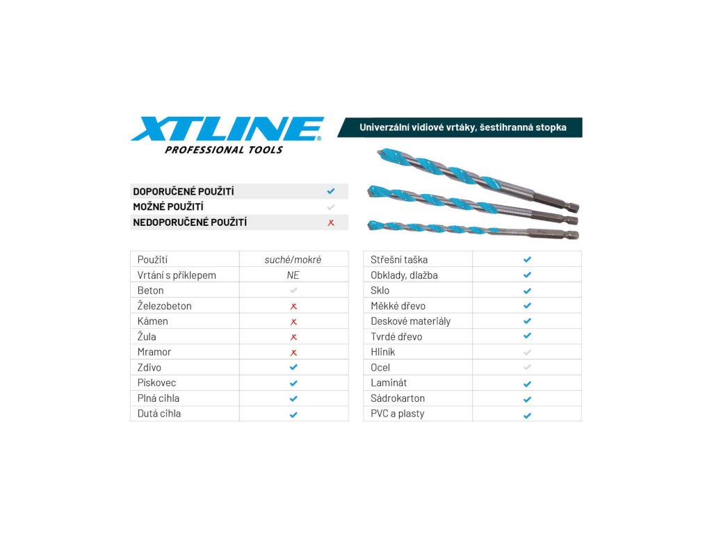 | Použití: | ocel, beton, zdivo, cihly, obklady, dřevo, plast, neželezné kovy apod. |