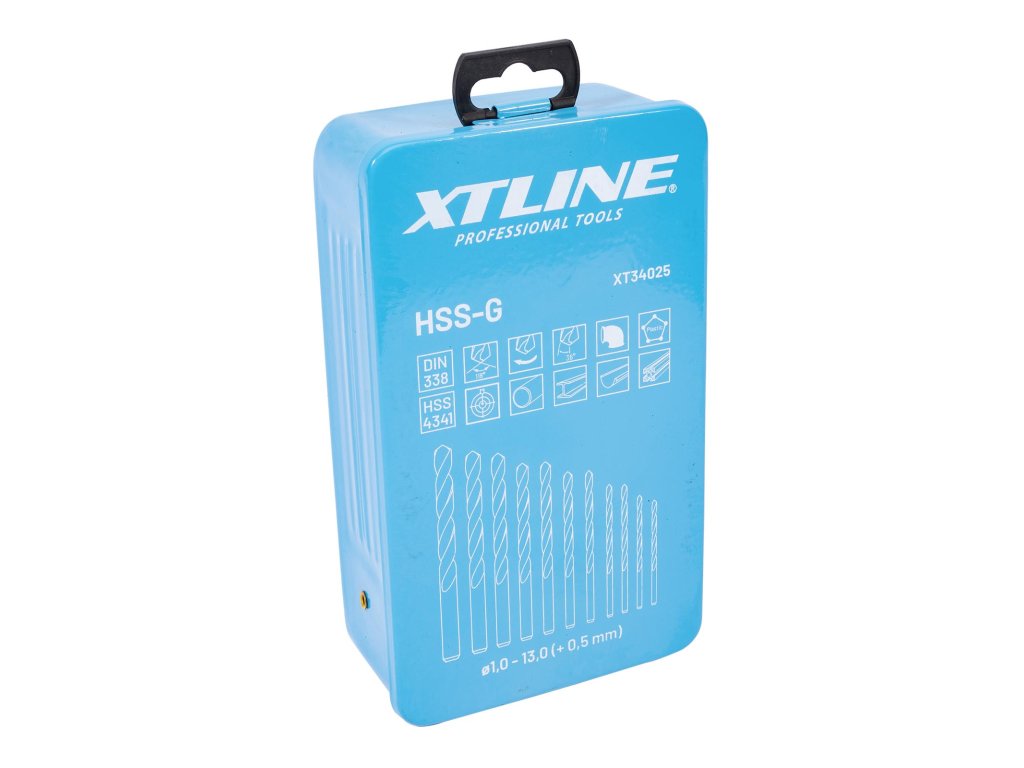 XTLINE Sada vybrušovaných vrtáků do kovu HSS-G, 25 dílů | 1-13 mm, kovový box