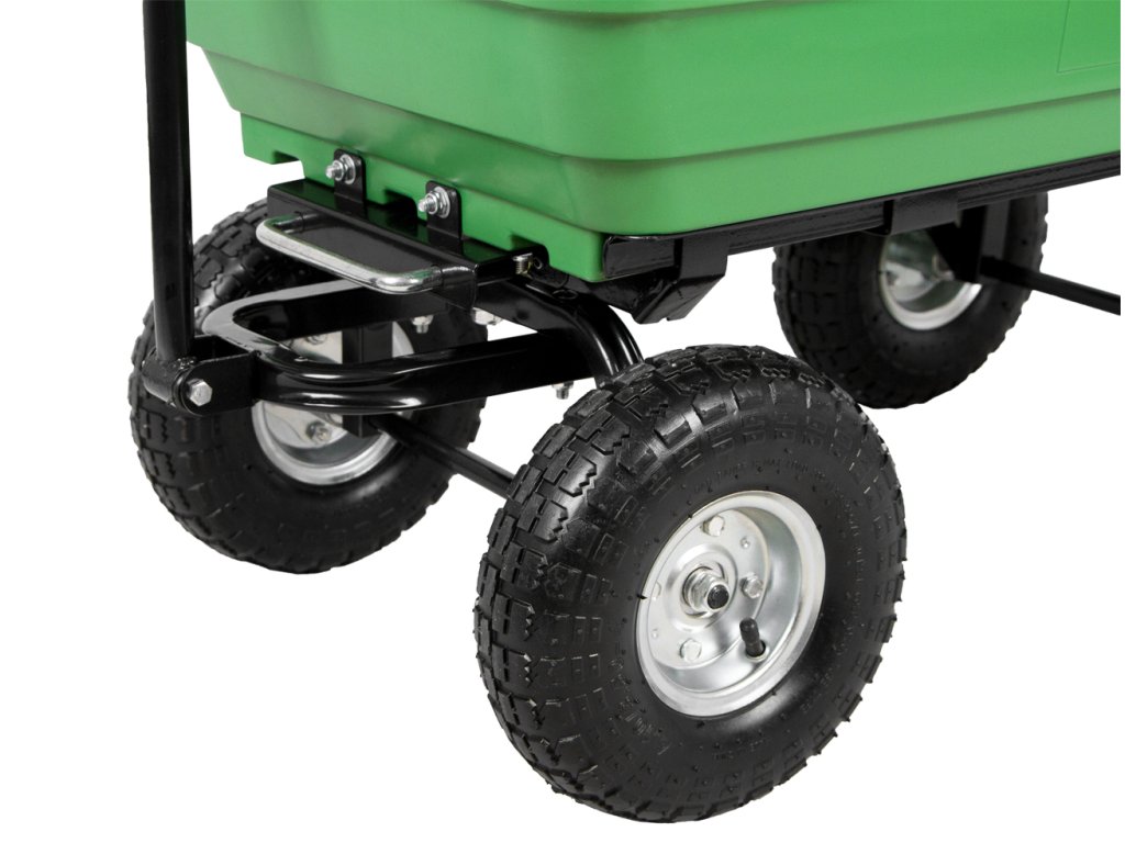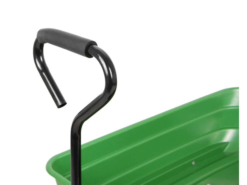 Konstrukce vozíku je složena ze stabilní ocelové konstrukce, plastové vaničky o objemu 75 l a nafukovacích koleček.