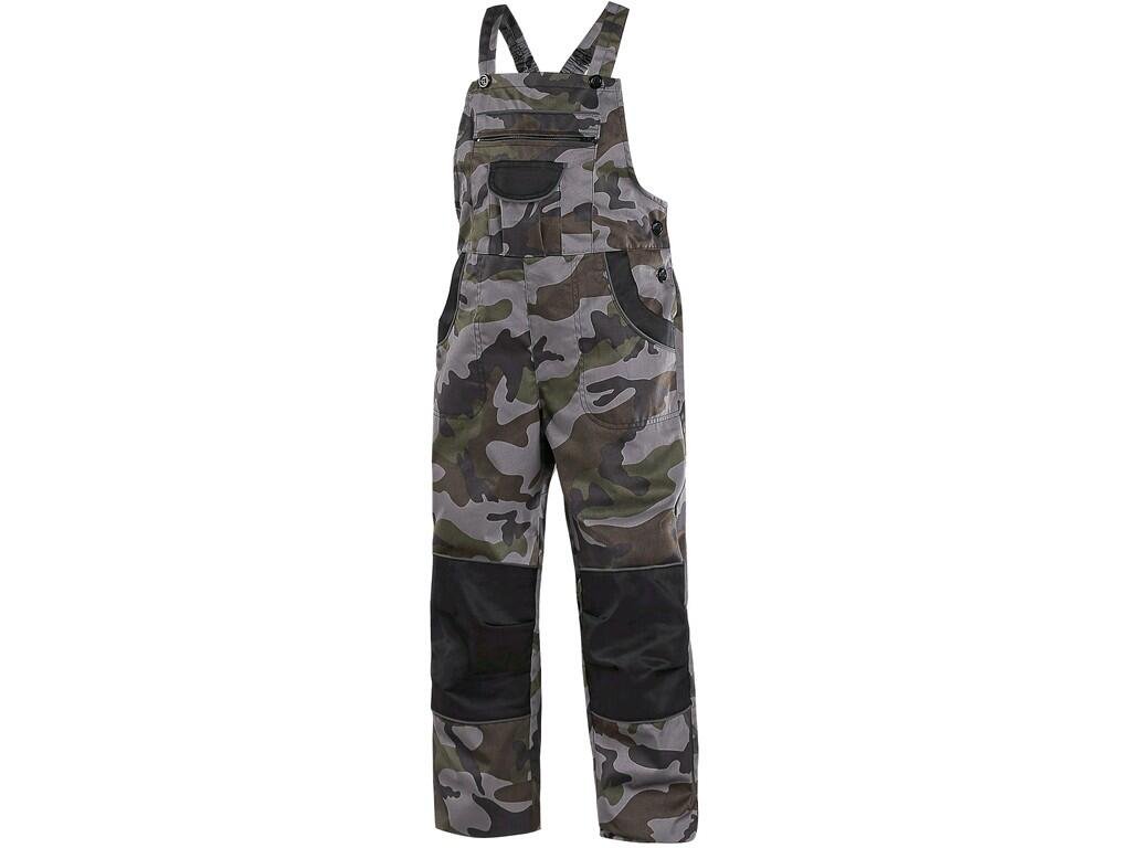 Dětské maskáčové kalhoty s náprsenkou, vybaveny zesílenými koleny a sedem pro delší životnost. Pas na knoflíky, vzadu do gumy, šle s gumou vzadu, náprsní kapsa na zip s menší kapsou, přední i zadní kapsy, boční kapsa, reflexní doplňky.Doplňkové parametry
