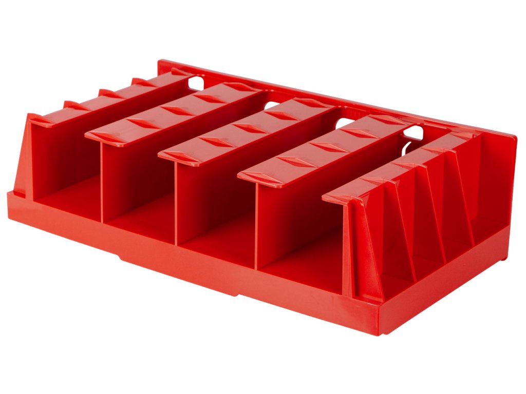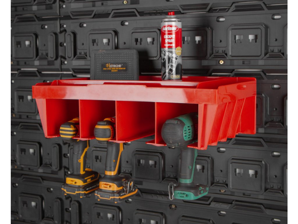 Držák na pneumatické a AKU nářadí je perfektním doplňkem k závěsné desce MW7000. Obsahuje 4 boxy, do kterých přehledně umístíte např. AKU vrtačku, šroubovák nebo pneumatický utahovák. Instalujte snadno kamkoliv do závěsného systému.