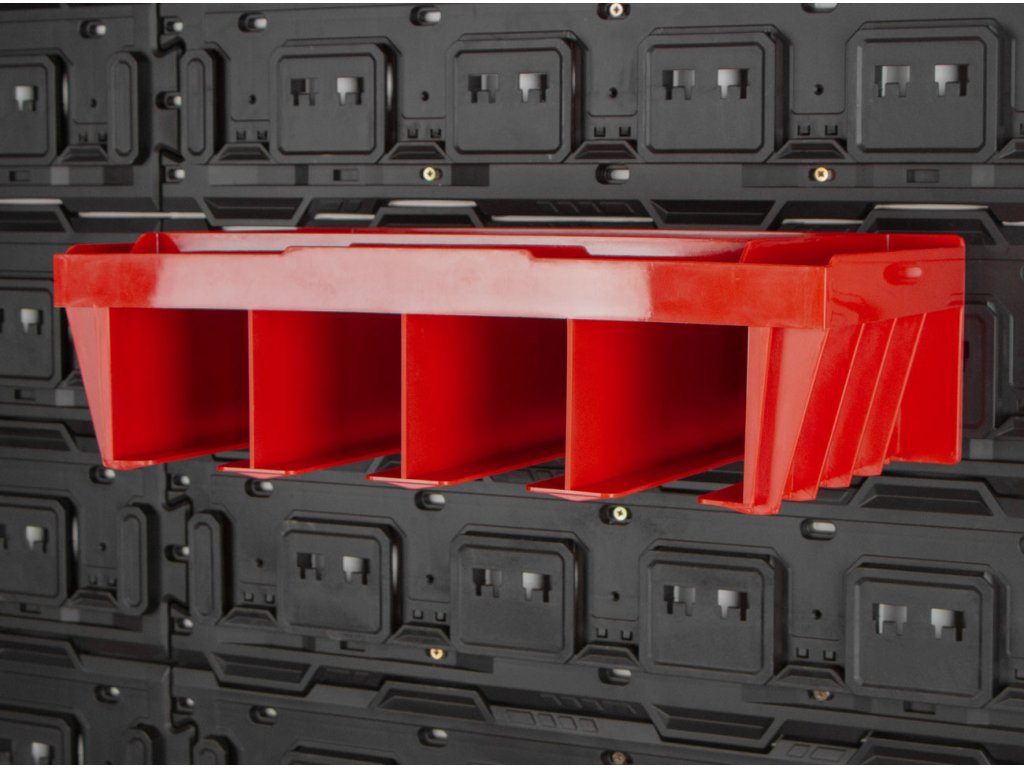 Rozměry 4 boxů pro zavěšení nářadí jsou 110 x 293 x 100 mm s drážkou pro vedení rukojeti o šířce 50 mm.