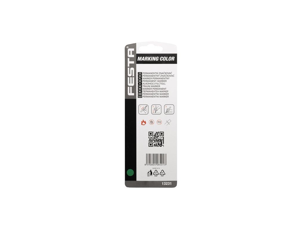 Speciální značkovací barva v hliníkovém pouzdře - zelený, síla hrotu 4 mm - popisy železných konstrukcí, skla, plastů, černých strečových folií a tmavých podkladů, max.80°C.Doplňkové parametry